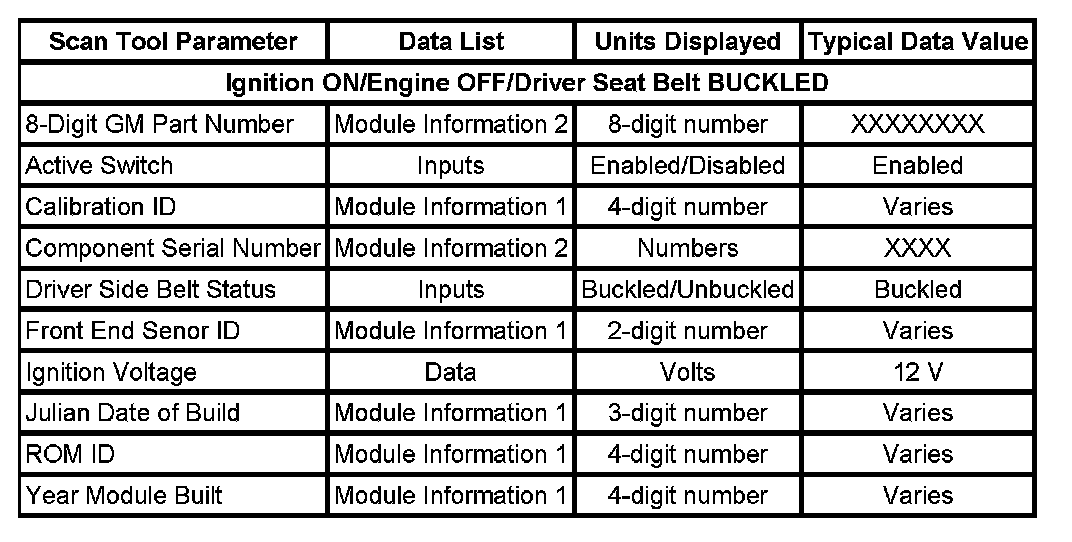 Use the SIR Scan Tool Data List as directed by a diagnostic table or to supplement the diagnostic procedures. Begin all of the diagnostic procedures with the Diagnostic System Check - Vehicle. Refer to the Diagnostic System Check - Vehicle in Vehicle DTC Information. Use the SIR Scan Tool Data List after determining the following: