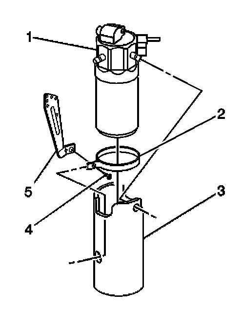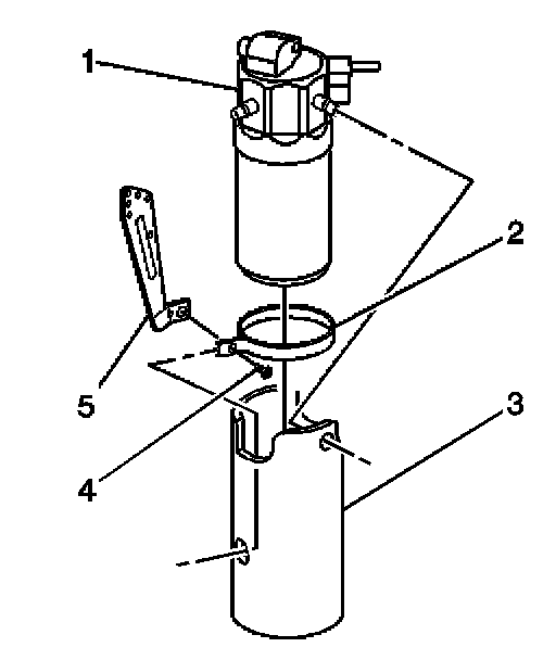 6. Remove the retaining screw (4) from the accumulator retaining bracket (2).