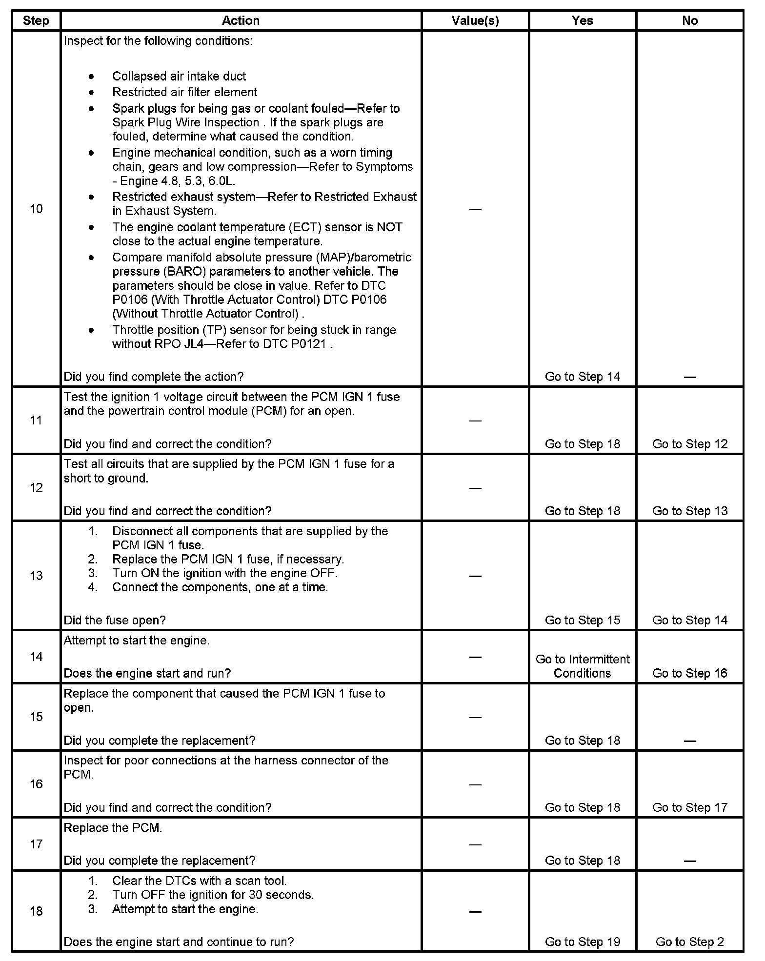 The Engine Cranks but Does Not Run diagnostic table assumes the following: