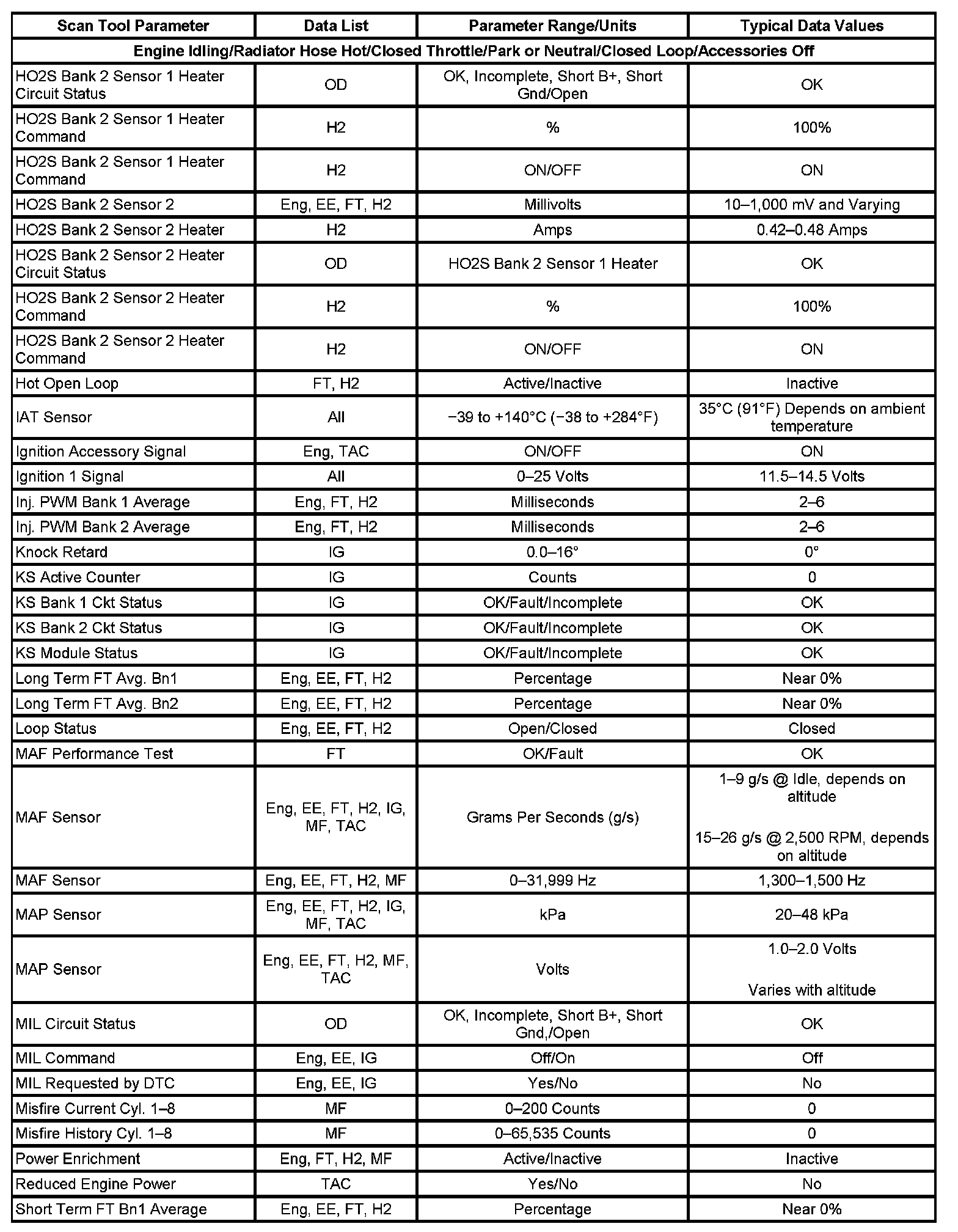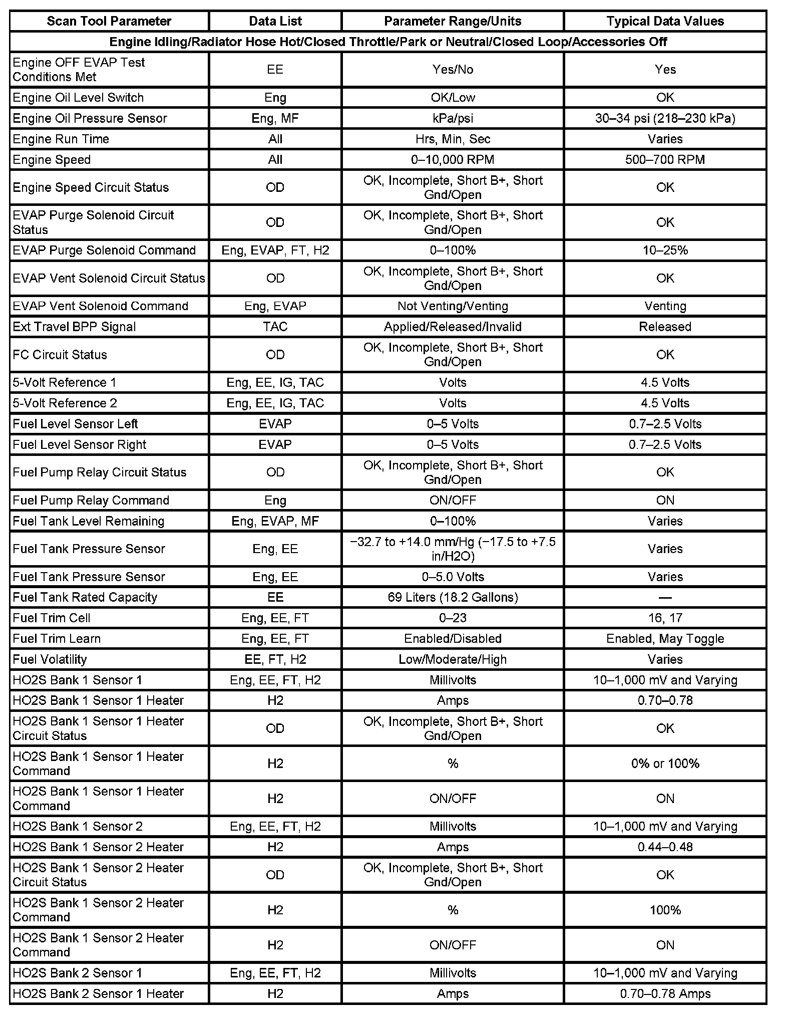 The column labeled Data List indicates where a parameter can be located on the scan tool. Refer to the scan tool operating manual for the exact locations of the data lists. The following is a description of each term listed: