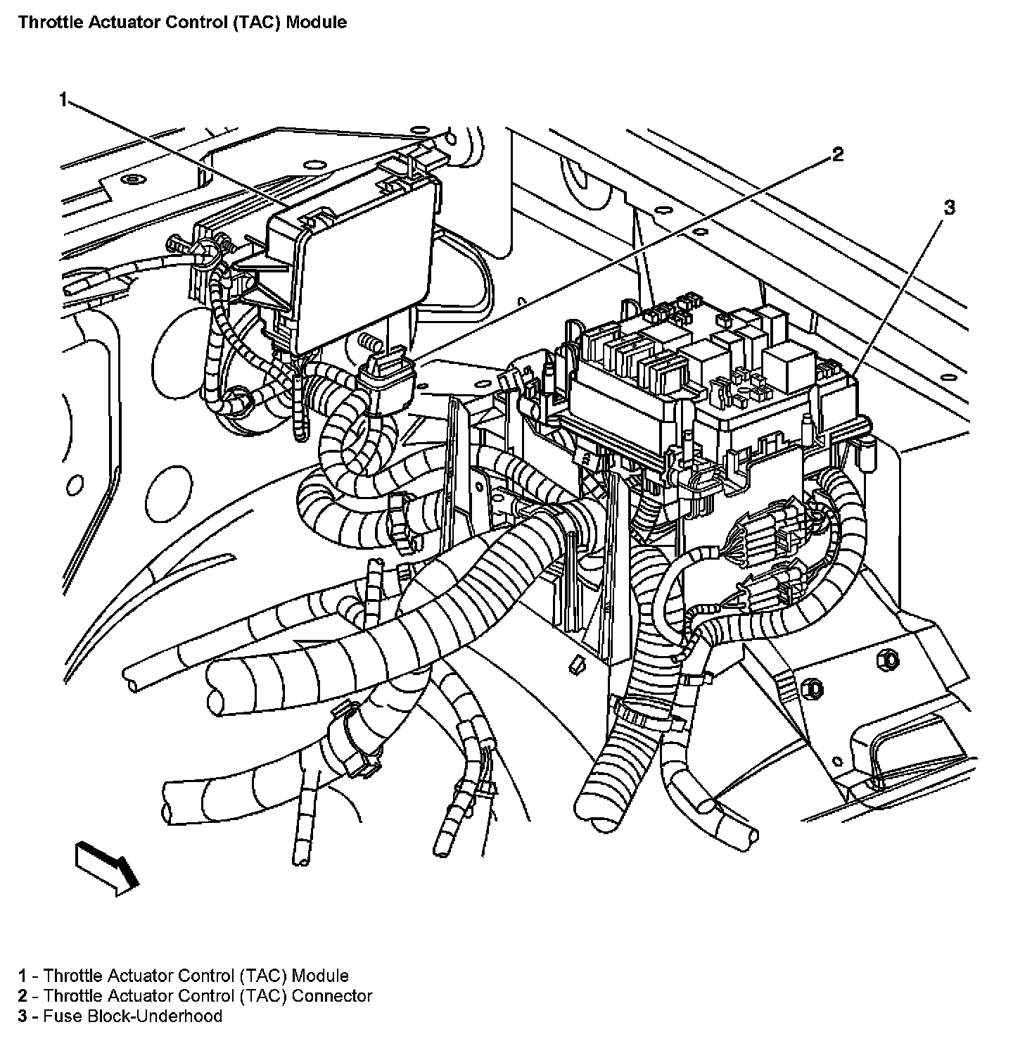 The Throttle Actuator Control Module (TAC) is located in the left rear of the engine compartment.