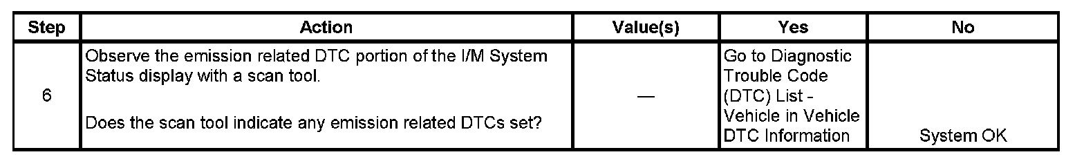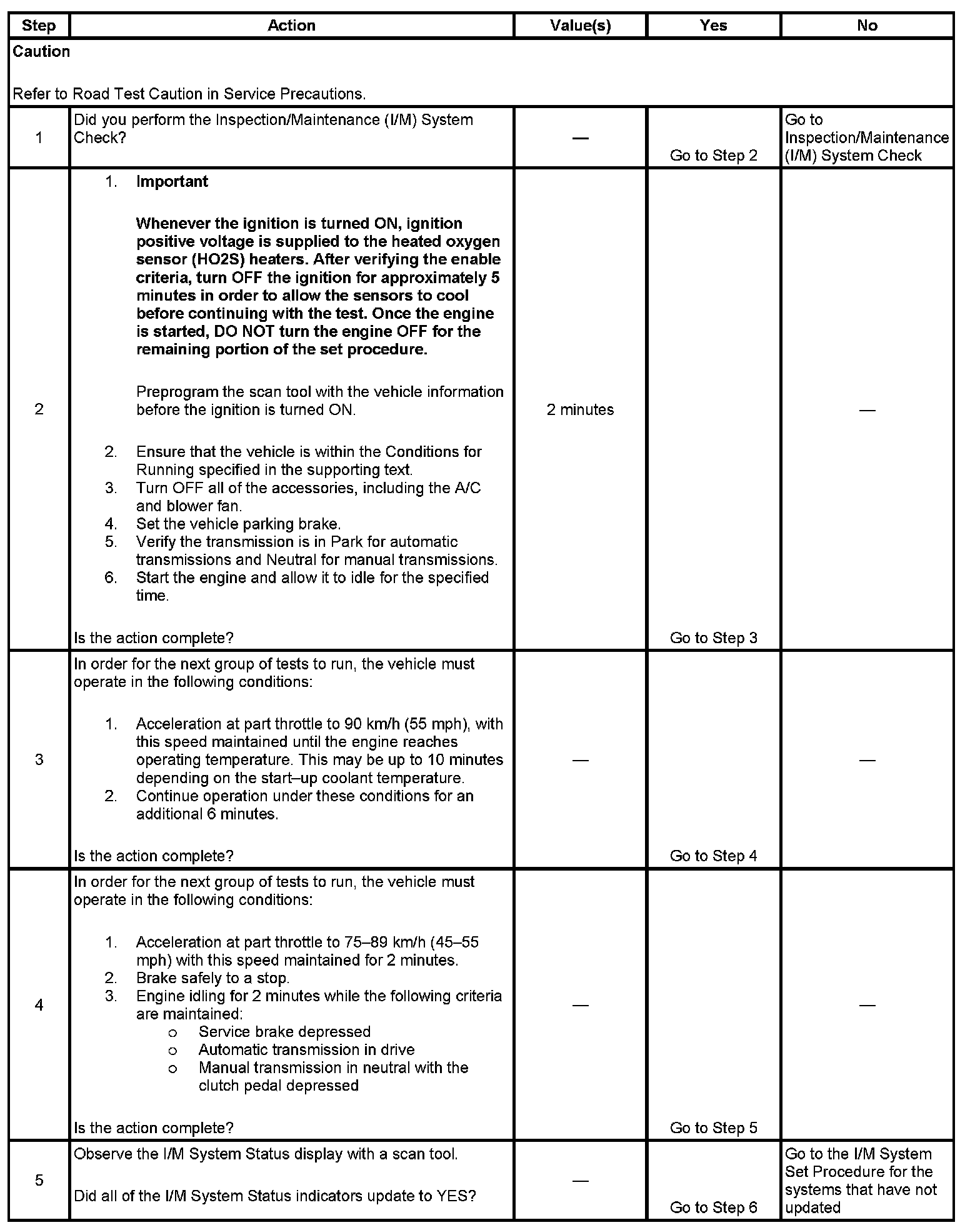 The scan tool can be used in order to monitor each of the I/M system status indicators during the I/M Complete System Set Procedure. When all of the indicators for a test step have updated to YES, testing can move on to the next step even if the remaining portion of the test is not complete. For example, step 3 is designed to run the EVAP, secondary air injection (AIR), and HO2S tests. The procedure instructs the technician to operate the vehicle in the enable conditions for 6 minutes. If all 3 tests have updated to YES within 4 minutes, you do not need to continue with the enable conditions and testing can advance to the next step.