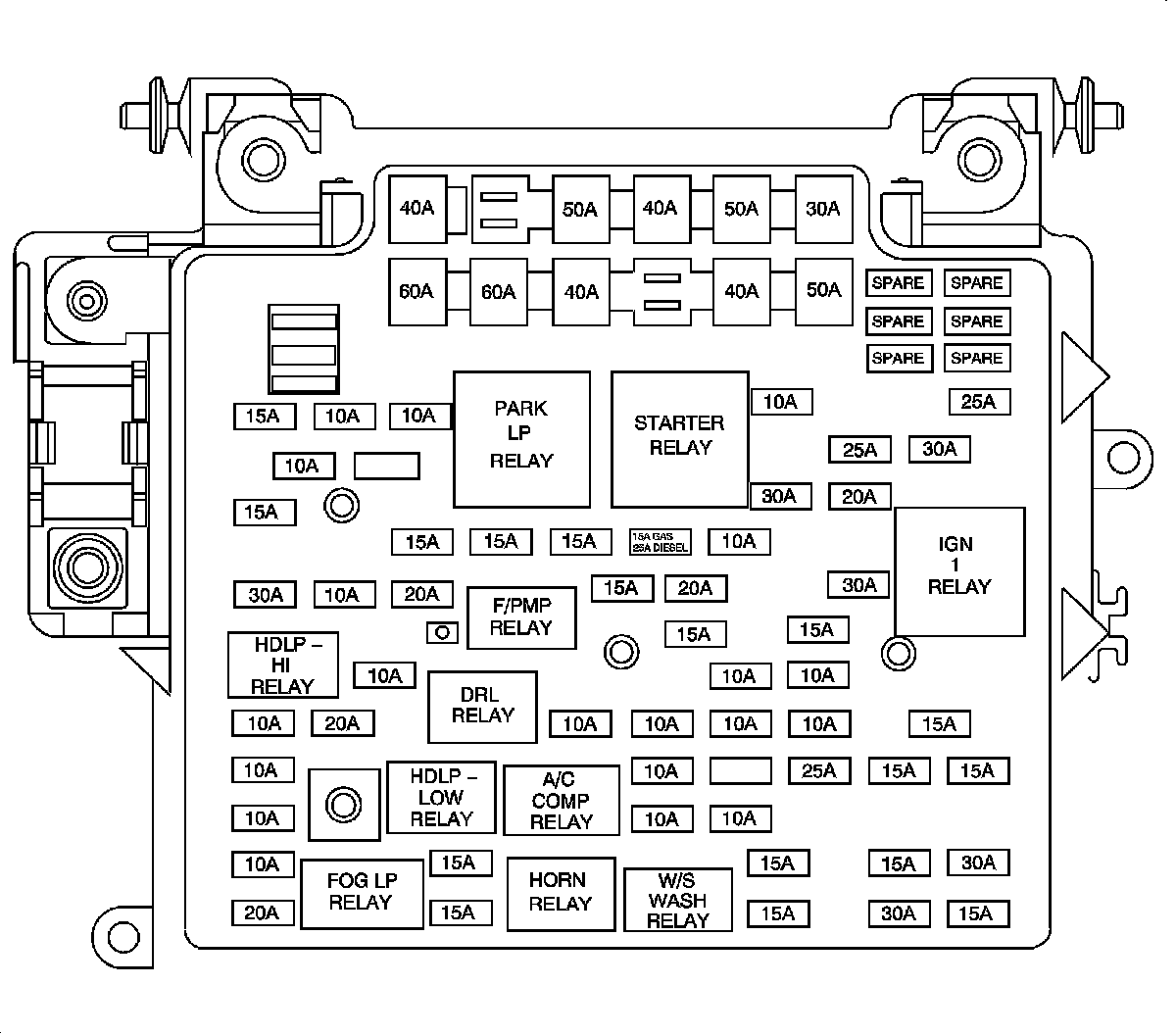 The Starter Relay is located on the Fuse Block - Underhood. The Fuse Block - Underhood is located on the left side of the engine compartment to the rear of the battery.