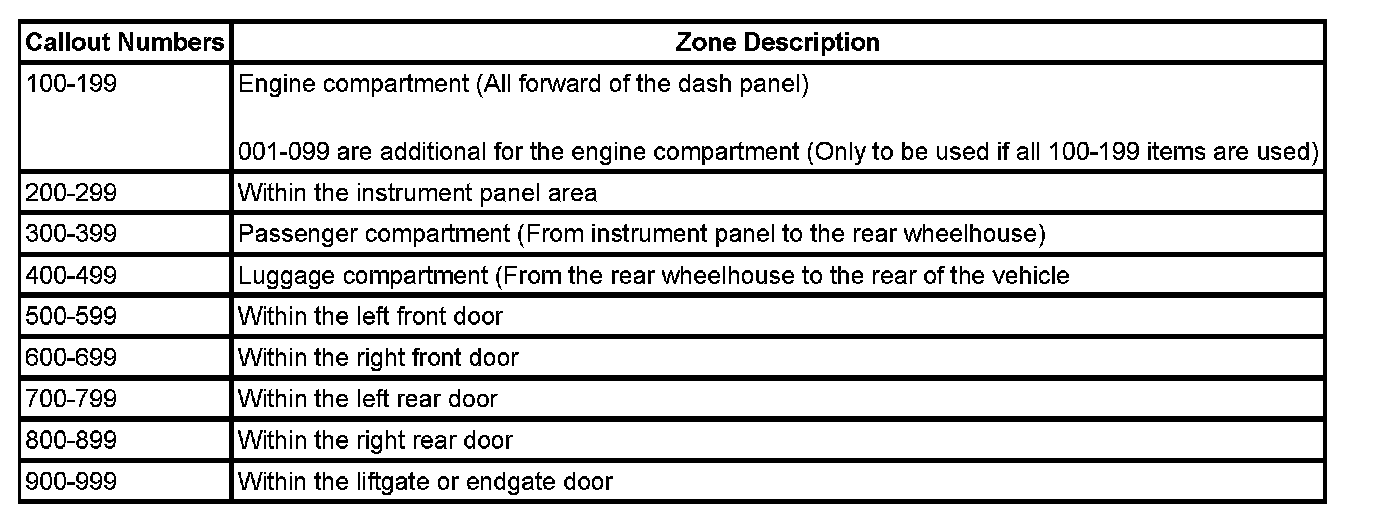 All grounds, in-line connectors, pass-through grommets, and splices have identifying numbers that correspond to where they are located in the vehicle. The table explains the numbering system.