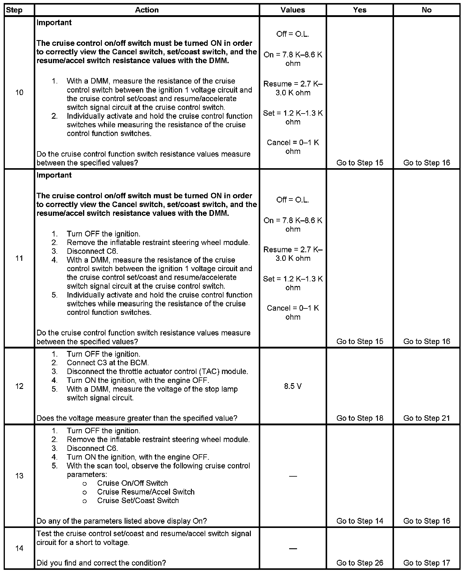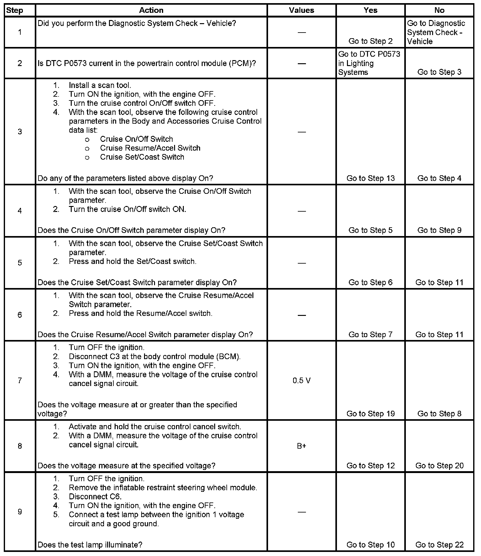 - Rotate the steering wheel to both steering stops and activate each cruise control switch separately. With a scan tool, observe the associated cruise control switch parameter in the Body and Accessories Cruise Control data list. This will help eliminate the possibility of a internally open or shorted inflatable restraint steering wheel module coil.