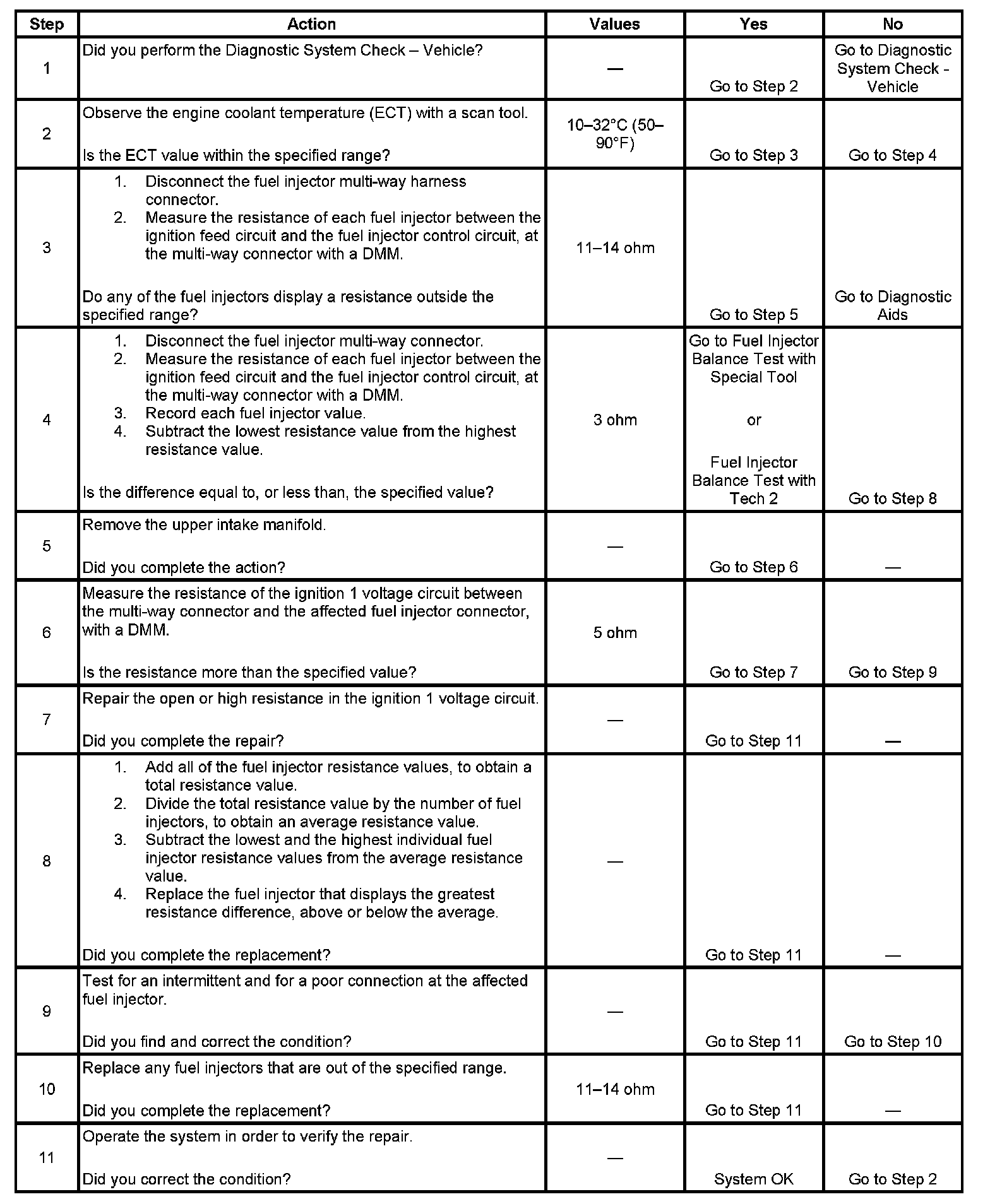 - If the fuel injector coil test does not isolate the condition perform the fuel injector balance test. Refer to Fuel Injector Balance Test with Special Tool or Fuel Injector Balance Test with Tech 2. Component Tests and General Diagnostics Component Tests and General Diagnostics
