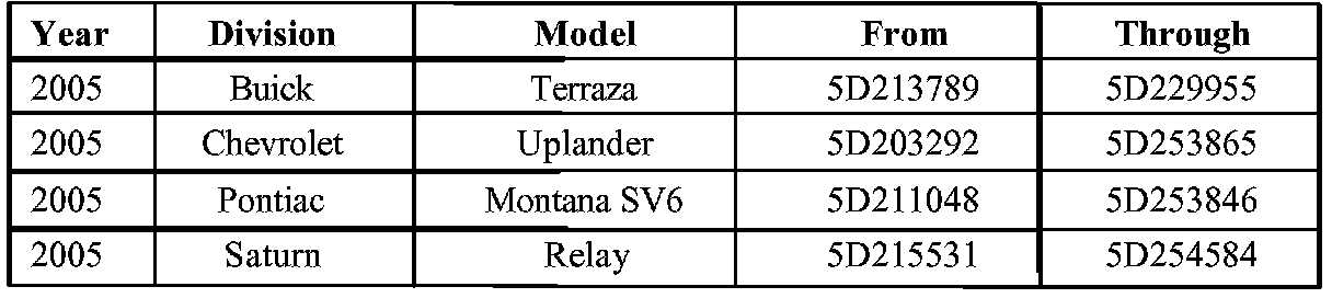 Involved are certain 2005 Buick Terraza, Chevrolet Uplander, Pontiac Montana SV6, and Saturn Relay vehicles built within the VIN breakpoints shown.