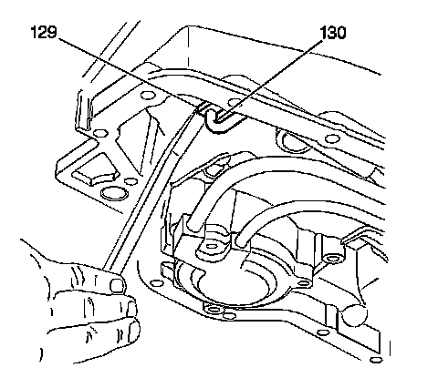 6. Use a large flat-bladed tool in order to gently pry the lube oil pipe retainer (129) from the case.
