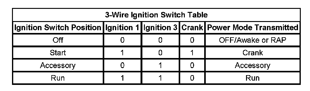 On vehicles that have several control modules connected by serial data circuits, one module is the power mode master (PMM). On this vehicle, the PMM is the body control module (BCM). The PMM receives 3 discrete ignition switch signals to differentiate which power mode will be sent over the Serial Data circuits. The table below illustrates the state of these inputs in correspondence to the ignition switch position