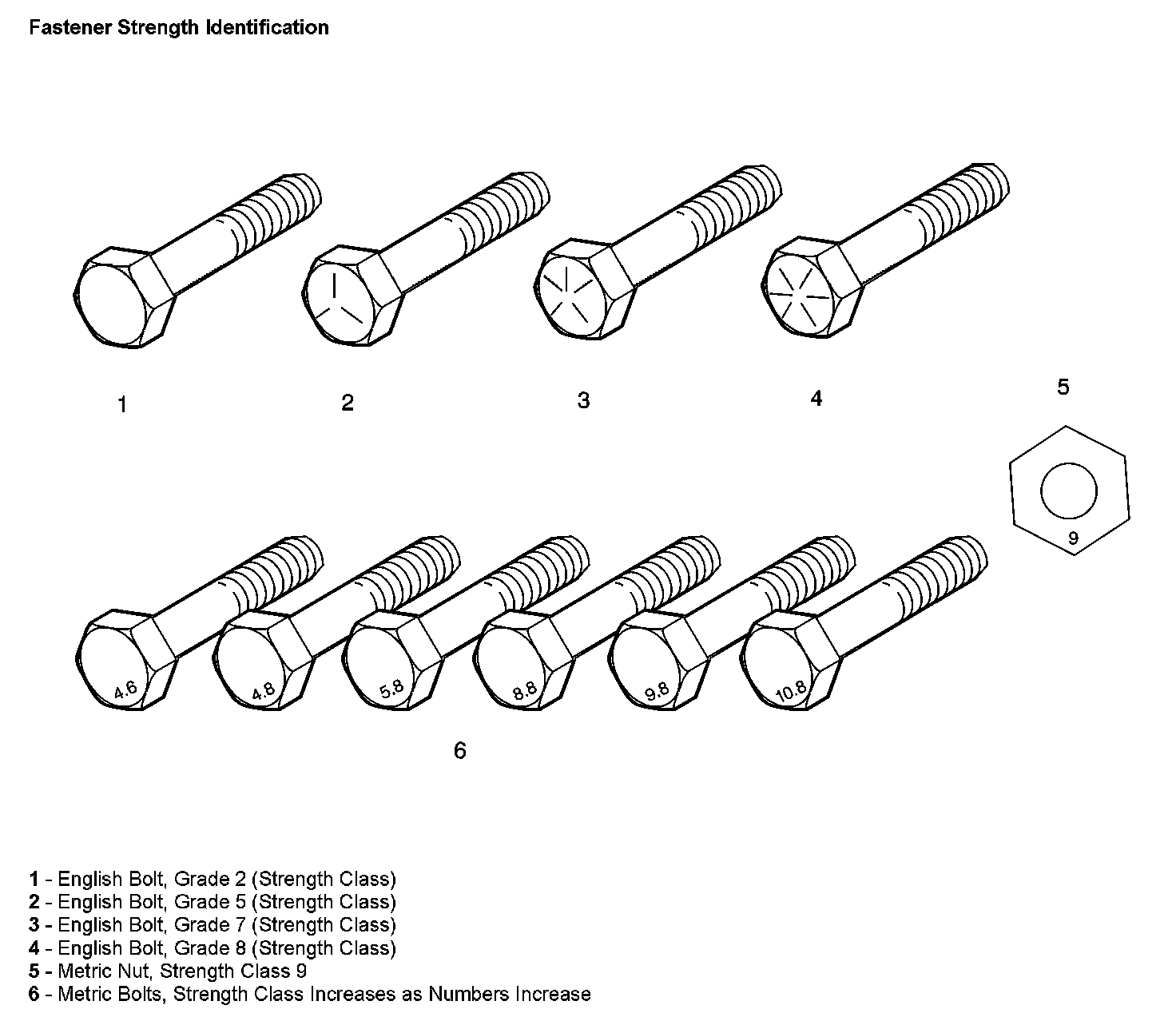 The most commonly used metric fastener strength property classes are 9.8 and 10.9. The class identification is embossed on the head of each bolt. The English, inch strength classes range from grade 2 to grade 8. Radial lines are embossed on the head of each bolt in order to identify the strength class. The number of lines on the head of the bolt is 2 lines less than the actual grade. For example, a grade 8 bolt will have 6 radial lines on the bolt head. Some metric nuts are marked with a single digit strength identification number on the nut face.