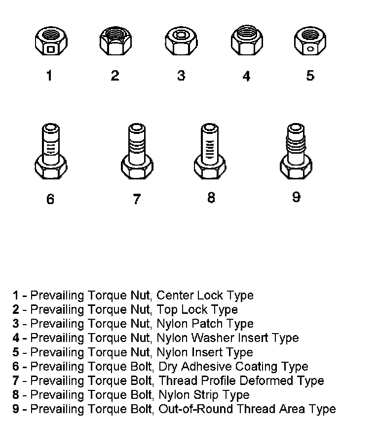These fasteners accomplish the thread interface by the presence of a thread-locking compound on the fastener threads. Refer to the appropriate repair procedure in order to determine if the fastener may be reused and the applicable thread-locking compound to apply to the fastener.
