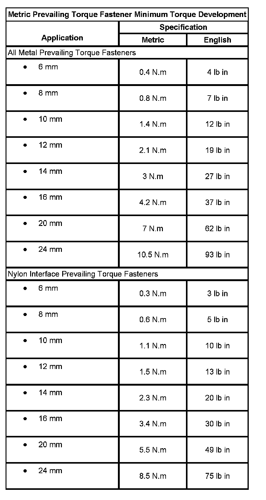 Metric Prevailing Torque Fastener Minimum Torque Development: