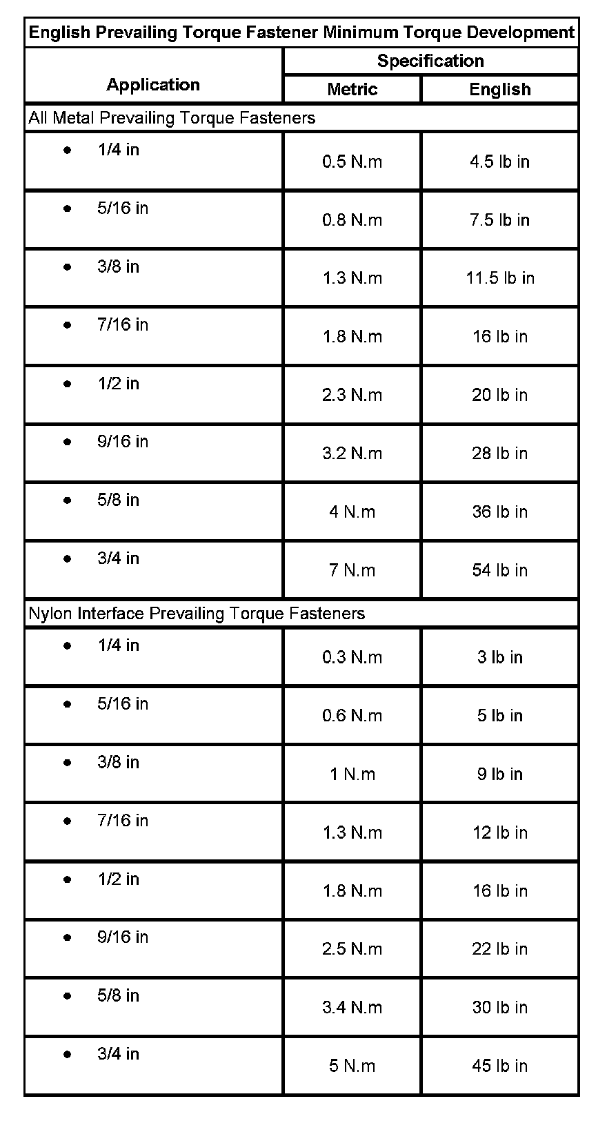 English Prevailing Torque Fastener Minimum Torque Development: