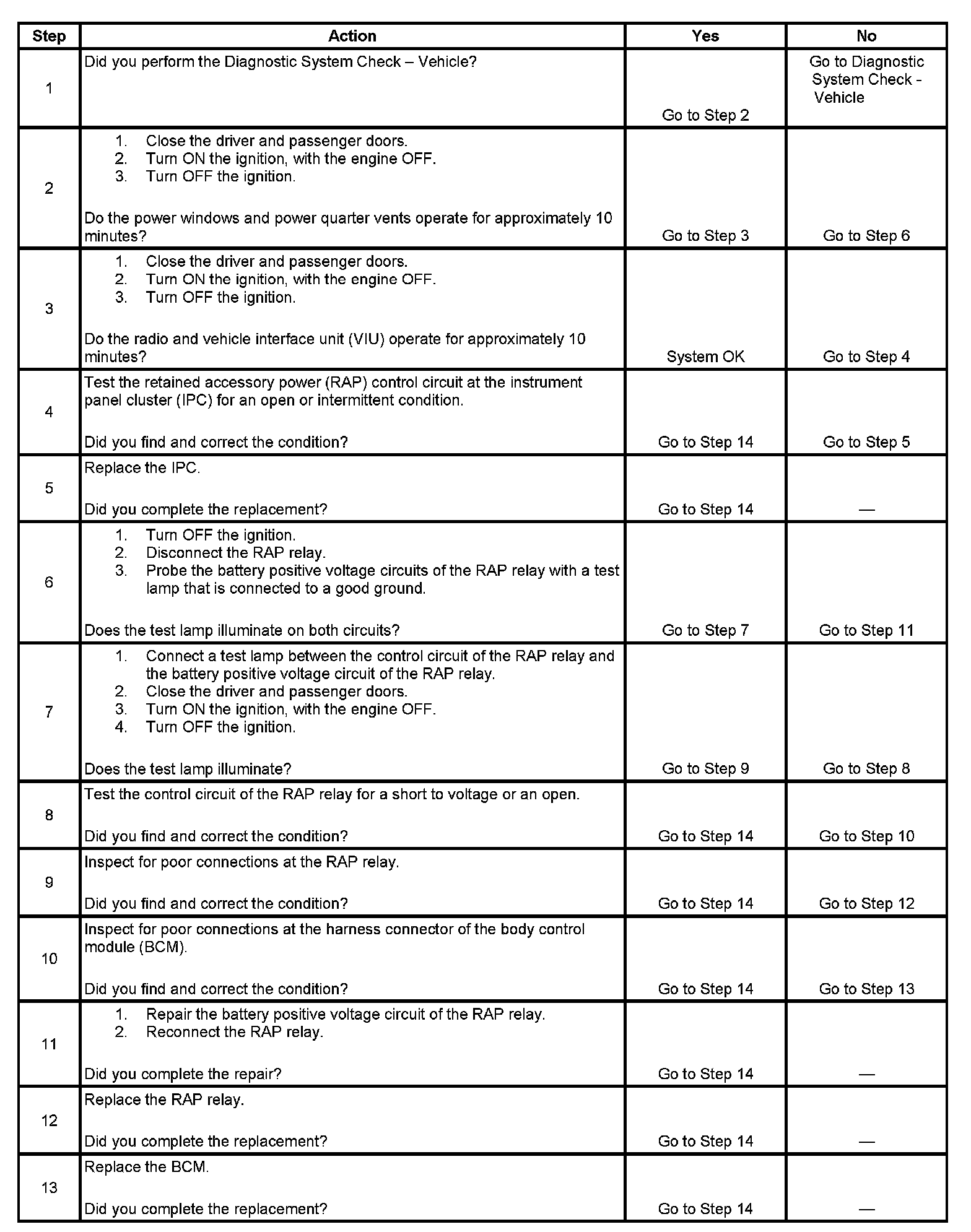 If the power windows operate properly under retained accessory power (RAP) conditions and the radio or vehicle interface unit (VIU) do not operate properly, the condition may exist in the class 2 circuit of the radio, VIU, or instrument panel cluster (IPC), or one of the individual modules. Refer to Scan Tool Does Not Communicate with Class 2 Device. Testing and Inspection