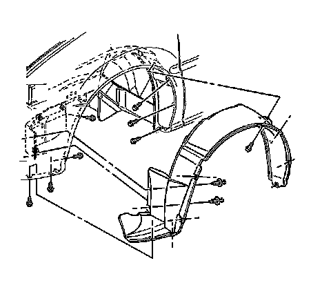 4. Remove the fender splash shield. Refer to Splash Shield Replacement - Wheelhouse (Splash Shield Replacement - Wheelhouse) (for Oldsmobile only).