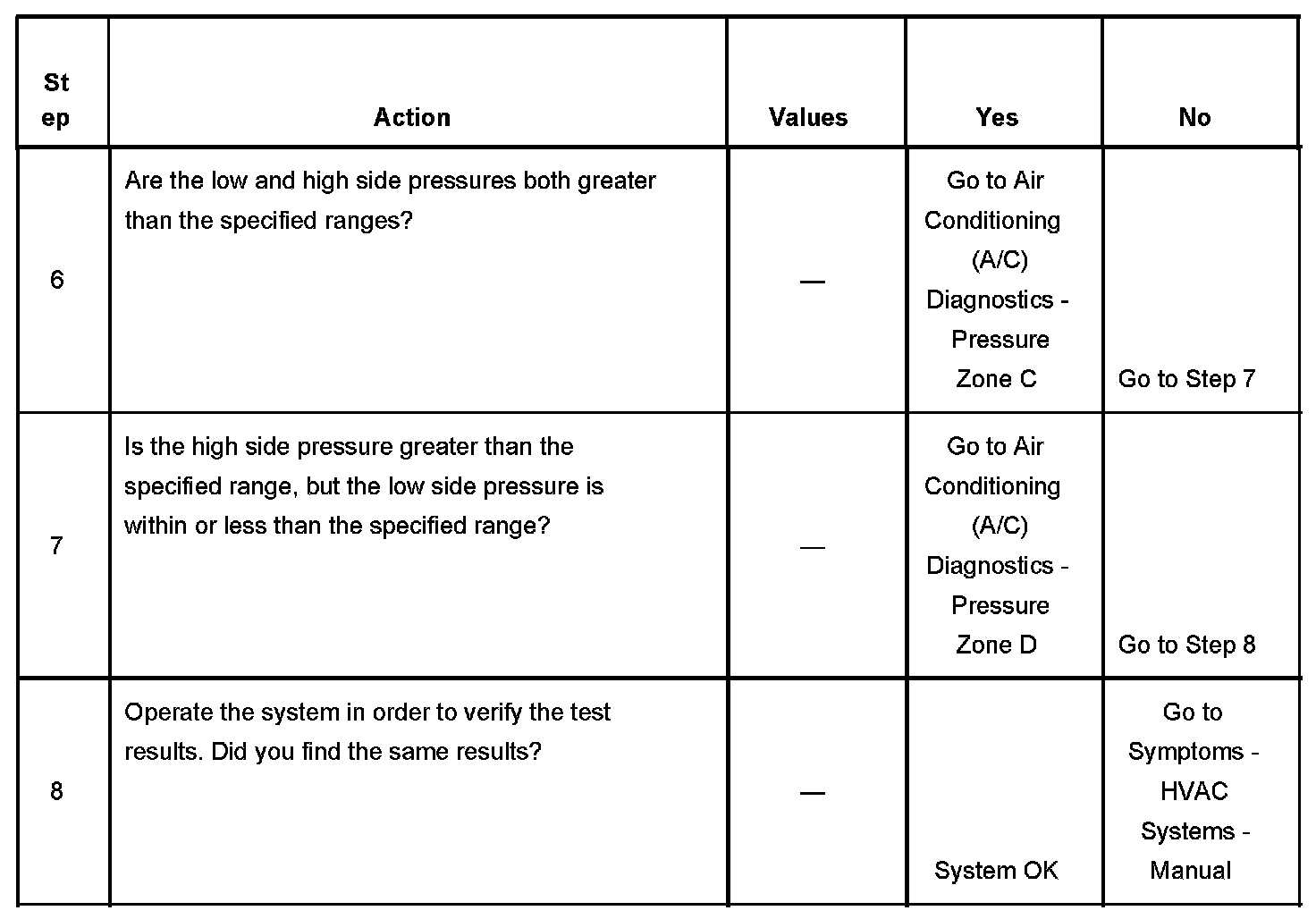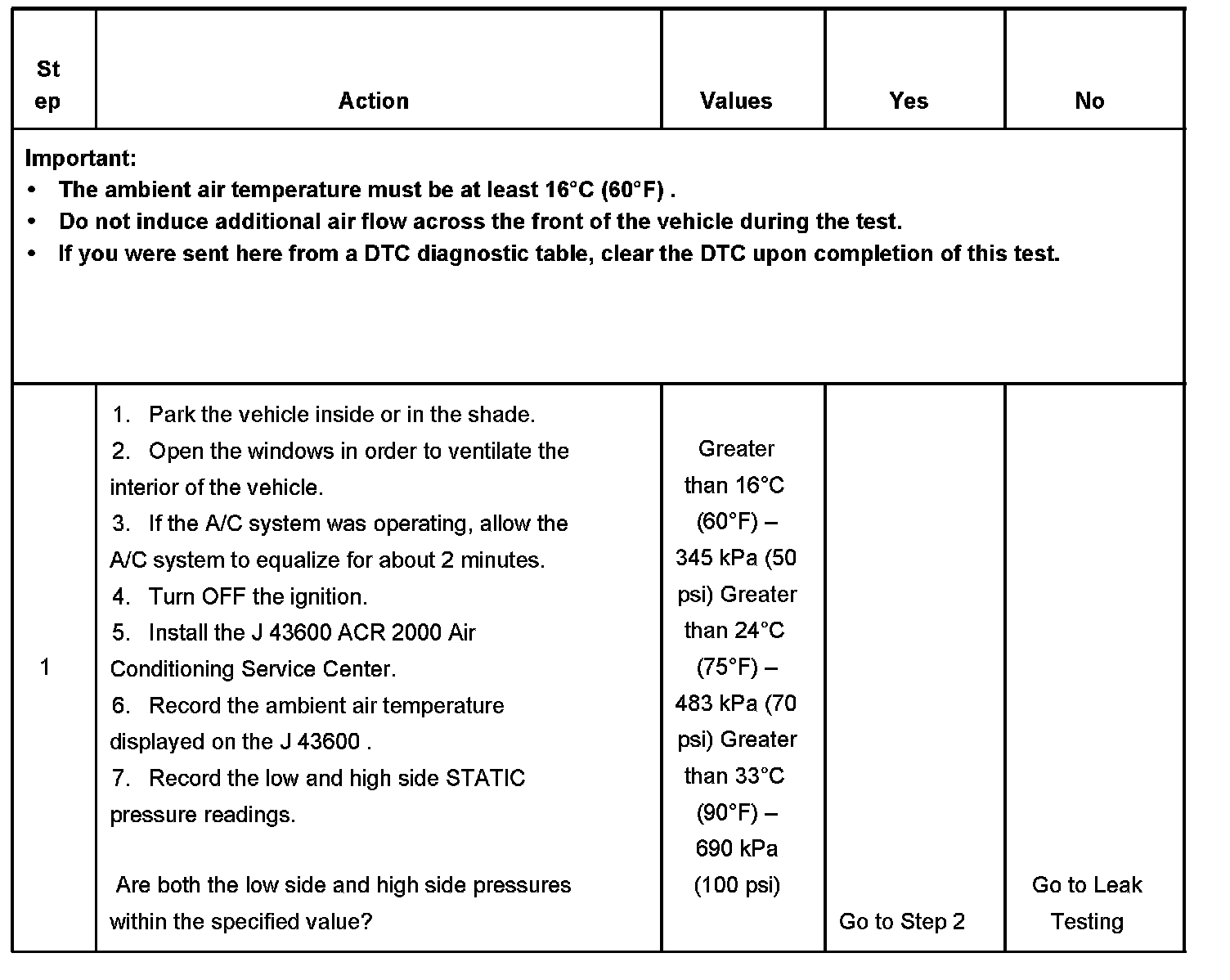 1. This step determines if the A/C system has at least the minimum refrigerant charge required to operate the system without damage.