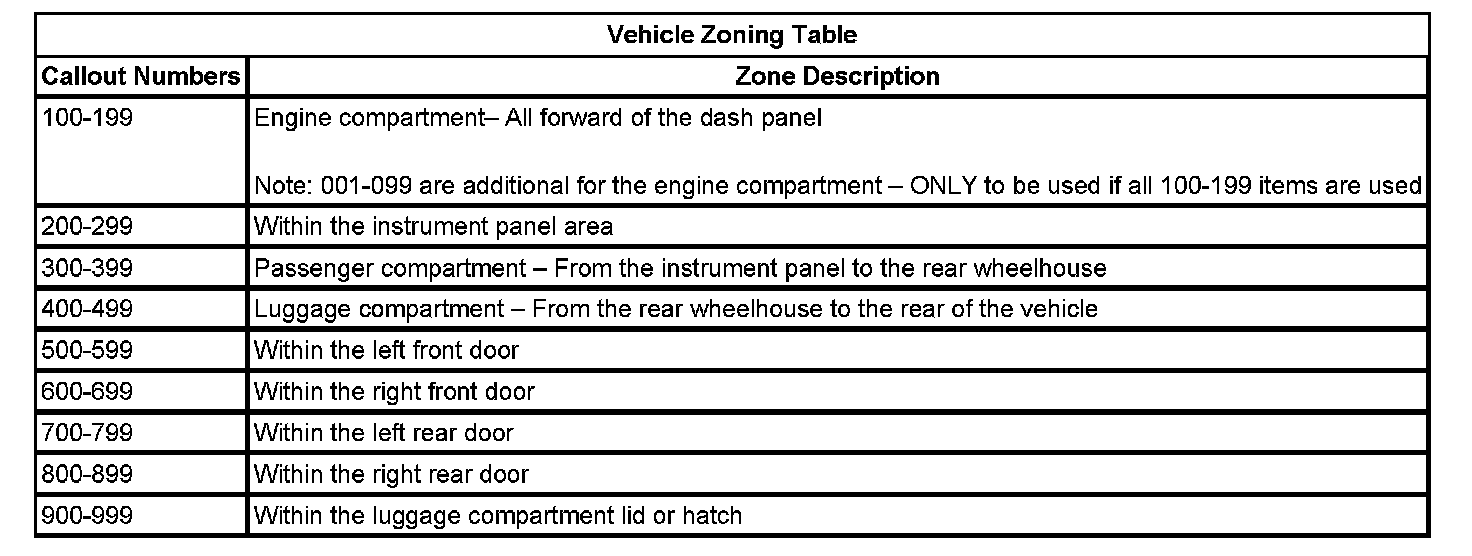 All grounds, in-line connectors, pass-through grommets, and splices have identifying numbers that correspond to where they are located in the vehicle. The table explains the numbering system.