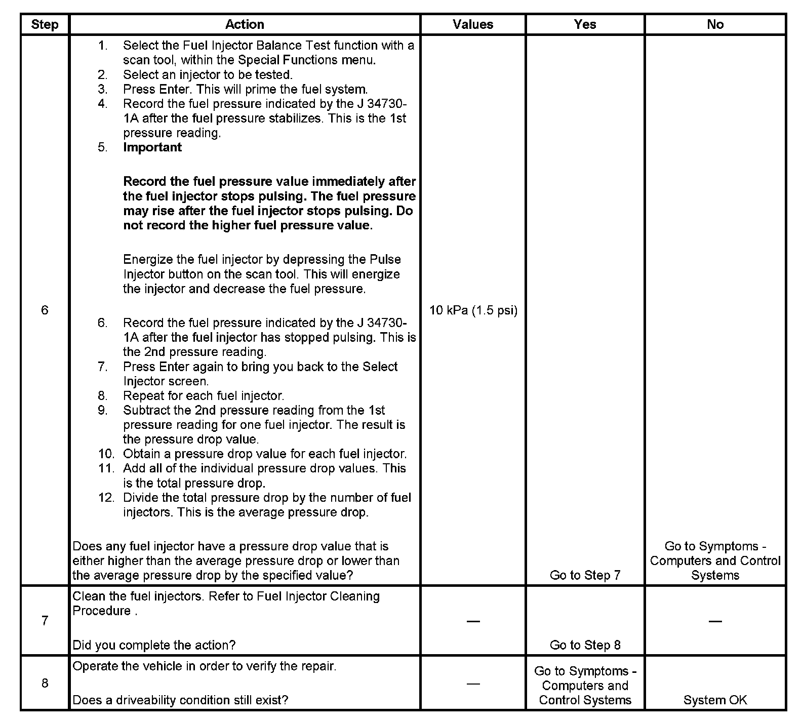 6. If the pressure drop value for each fuel injector is within 10 kPa (1.5 psi) of the average pressure drop value, the fuel injectors are flowing properly.