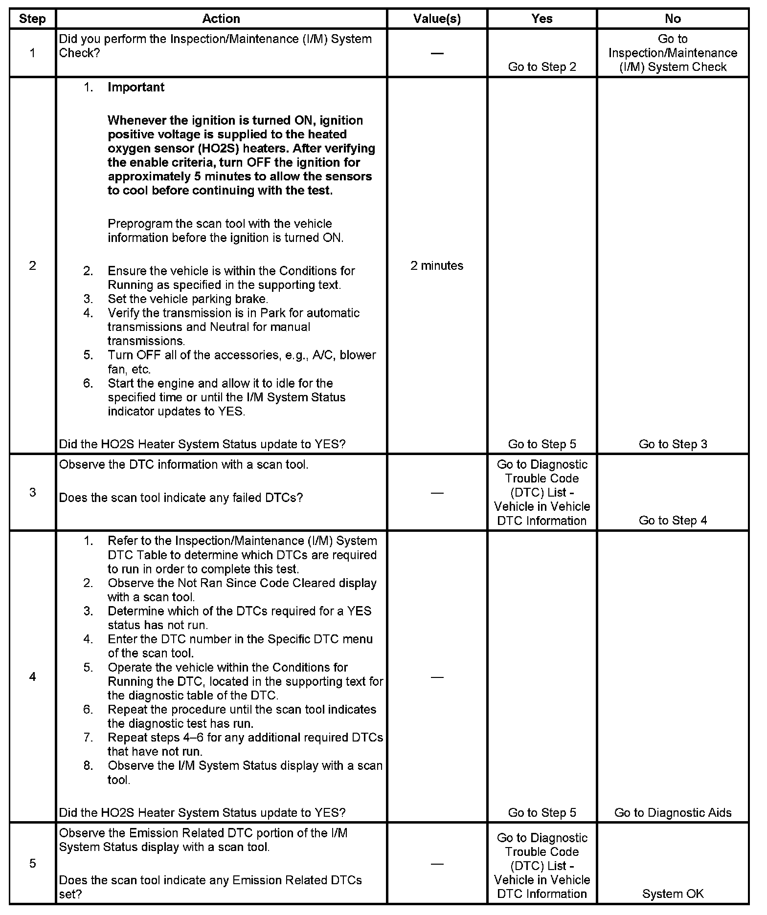 The purpose of this test is to satisfy the enable criteria necessary to execute inspection/maintenance (I/M) readiness diagnostics for the heated oxygen sensor (HO2S) system. The test may be used to set the I/M System Status to YES. The I/M System Status display on the scan tool provides an indication of whether the control module has completed the required tests. The I/M System Status does not indicate that the tests have passed or failed. When all of the diagnostics for a specific system have run and passed, the I/M System Status will update to YES. If a test for a specific system has failed, the I/M System Status will update to YES, indicating a determination was made, even if all of the other tests for that system have not run.