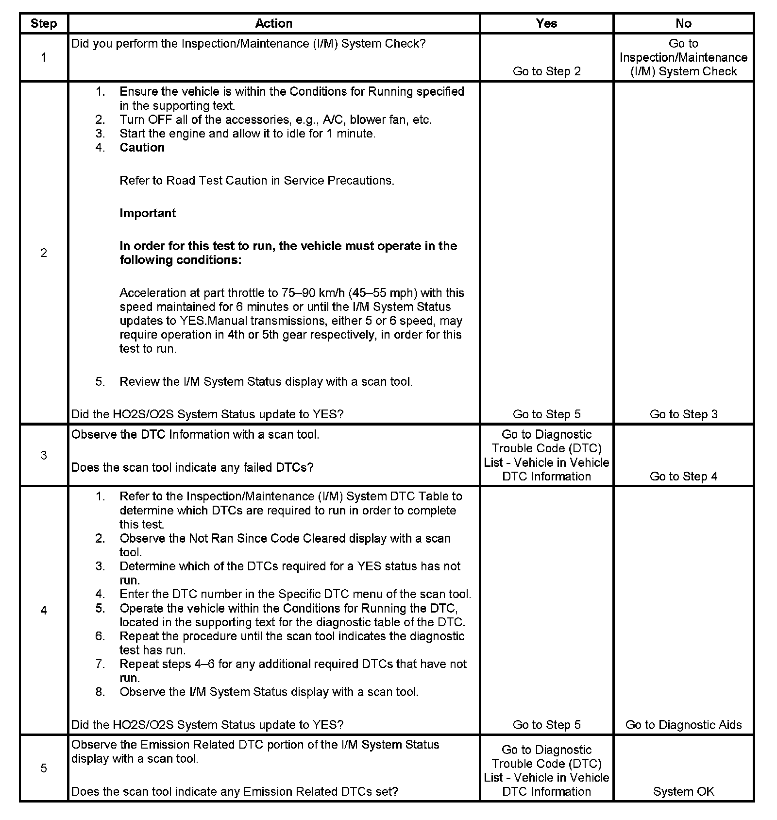 The purpose of this test is to satisfy the enable criteria necessary to execute inspection/maintenance (I/M) readiness diagnostics for the oxygen sensor (O2S, HO2S) system. The test may be used to set the I/M System Status to YES. The I/M System Status display on the scan tool provides an indication of whether the control module has completed the required tests. The I/M System Status does not indicate that the tests have passed or failed. When all of the diagnostics for a specific system have run and passed, the I/M System Status will update to YES. If a test for a specific system has failed, the I/M System Status will update to YES, indicating a determination was made, even if all of the other tests for that system have not run.