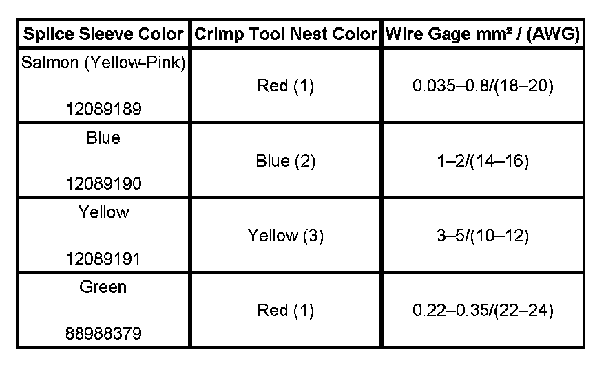 5. Use the Splice Crimp Tool from the J 38125-D to crimp splice sleeve. In order to position the splice sleeve in the proper color nest of the Splice Crimp Tool, refer to the table at the beginning of this repair procedure.