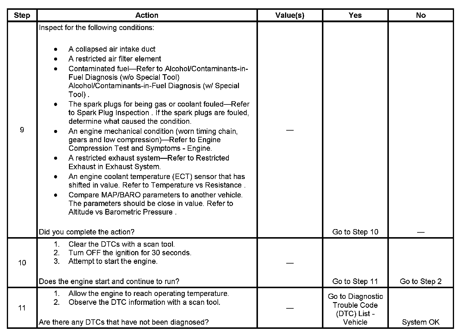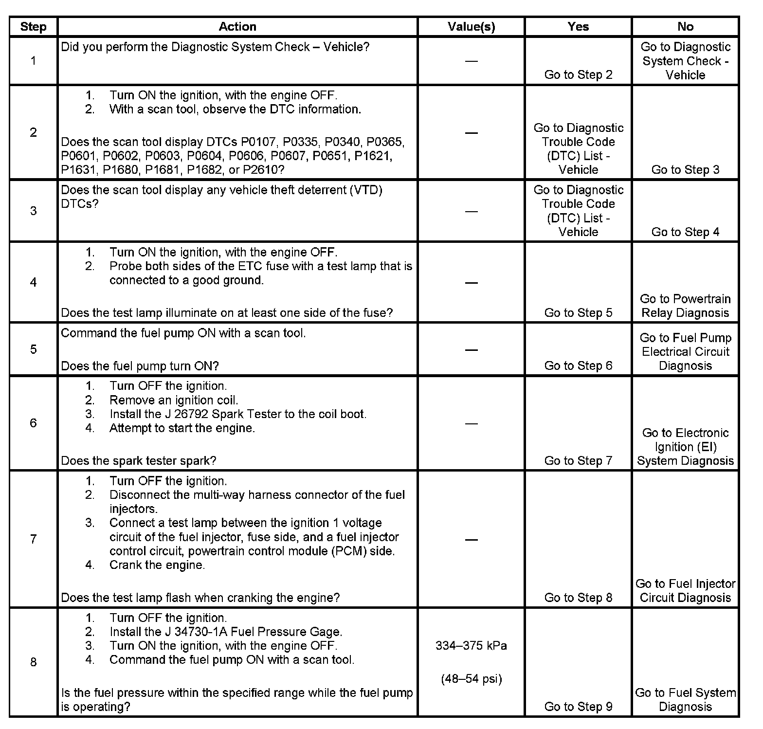 The Engine Cranks but Does Not Run diagnostic table is an organized approach to identifying a condition that causes an engine not to start. The Engine Cranks but Does Not Run diagnostic table directs the service technician to the appropriate system diagnosis.