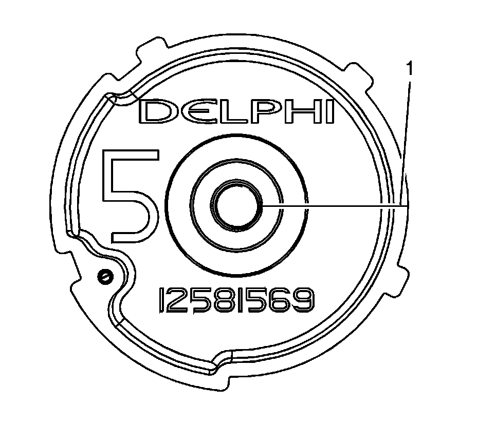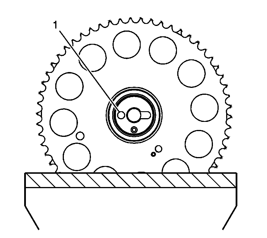 2. Scribe or draw a line (1) on the camshaft position actuator outer ring face, in the full advanced position. With the engine at TDC on #1 cylinder, the wording should be level.