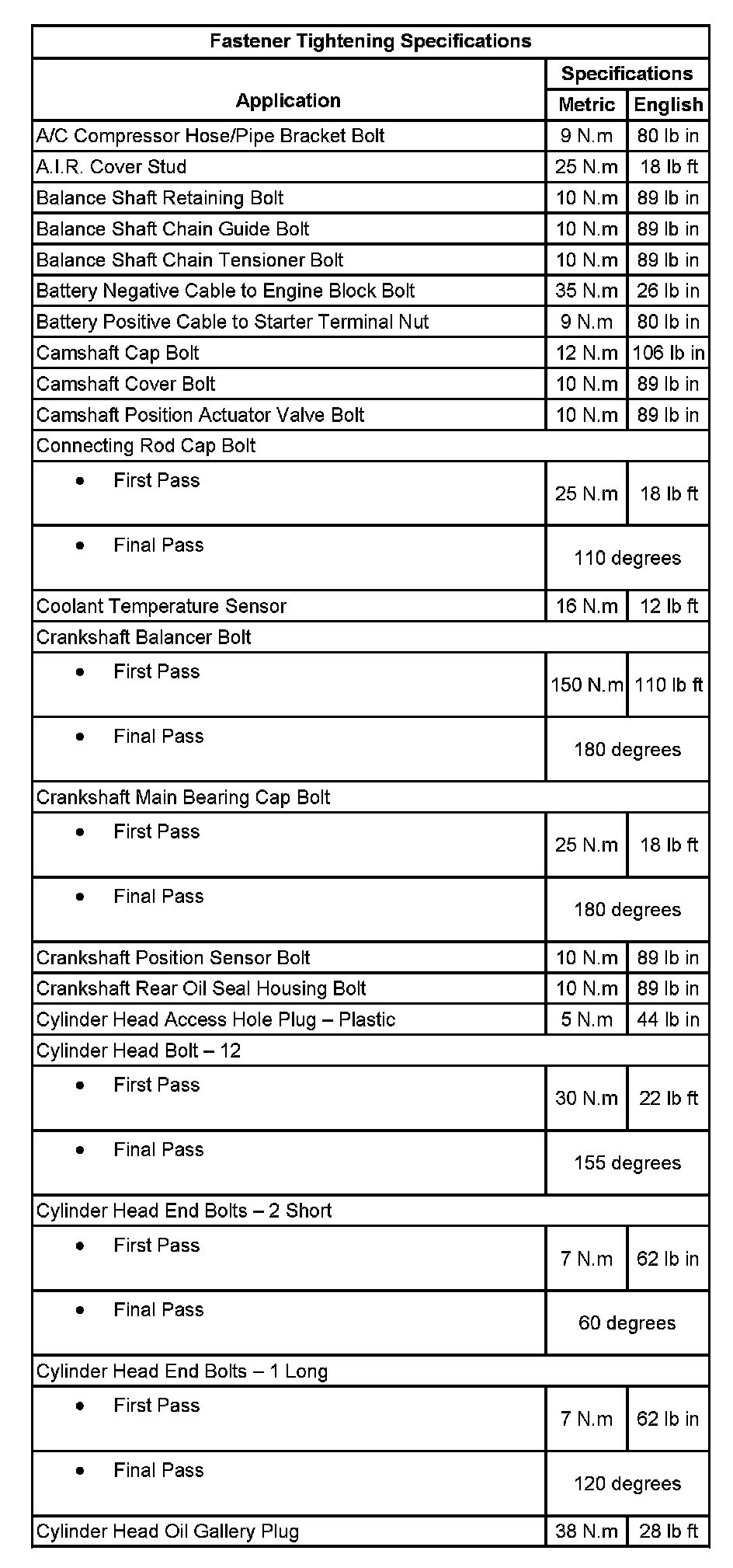 Fastener Tightening Specifications: