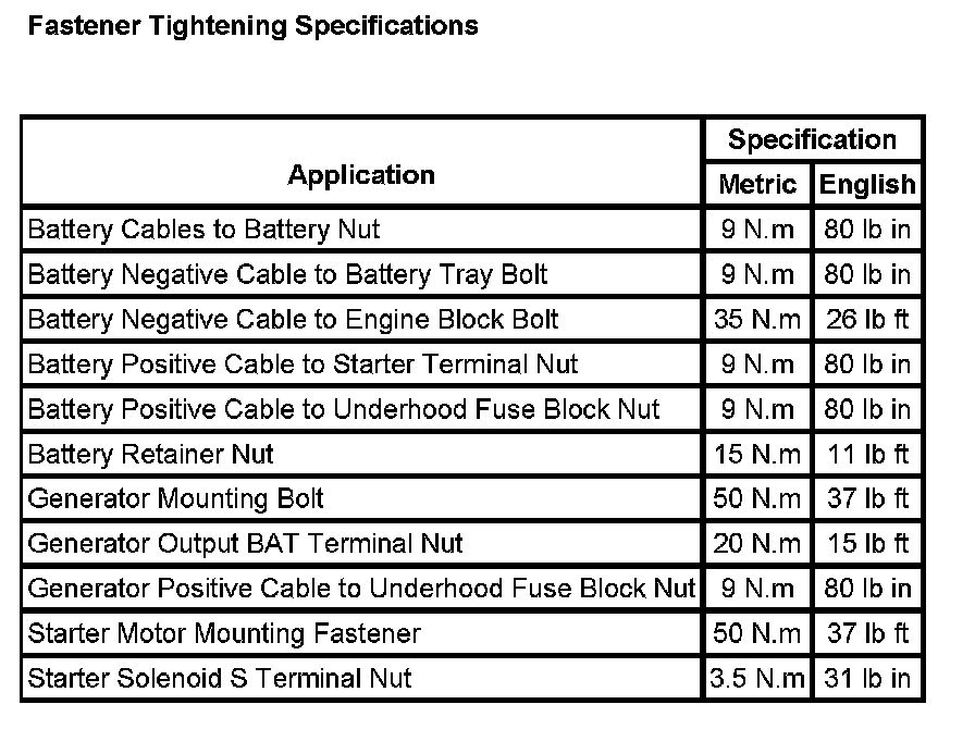 Starting and Charging: Specifications