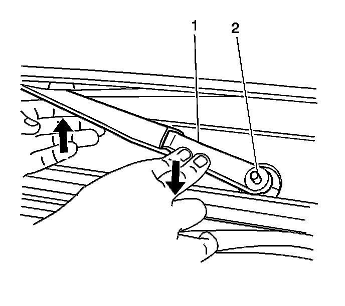 2. Lift the wiper blade off the windshield and install the wiper arm (1) to the wiper arm pivot shaft (2).