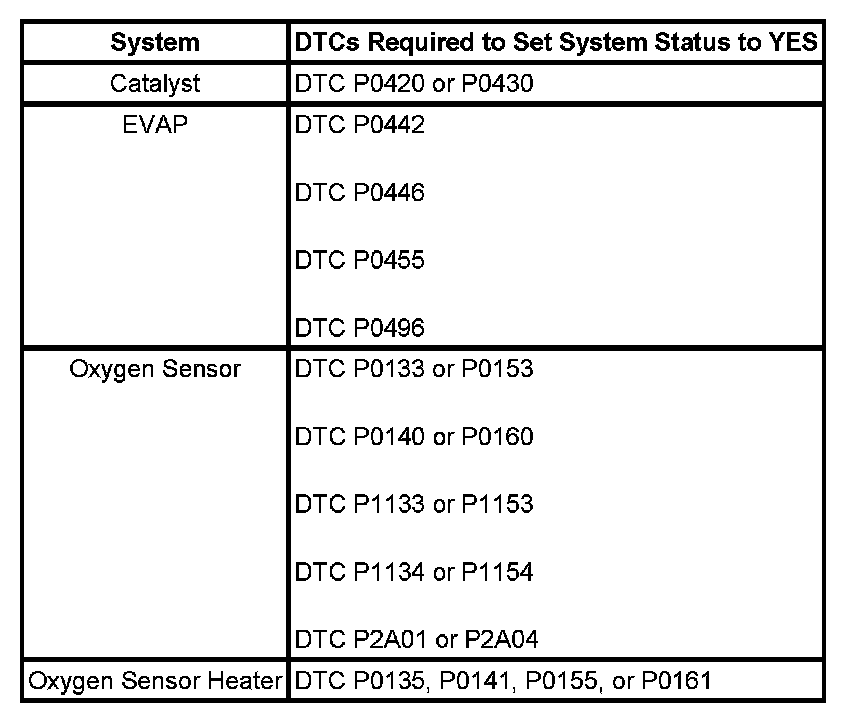 Inspection/Maintenance (I/M) System DTC Table: