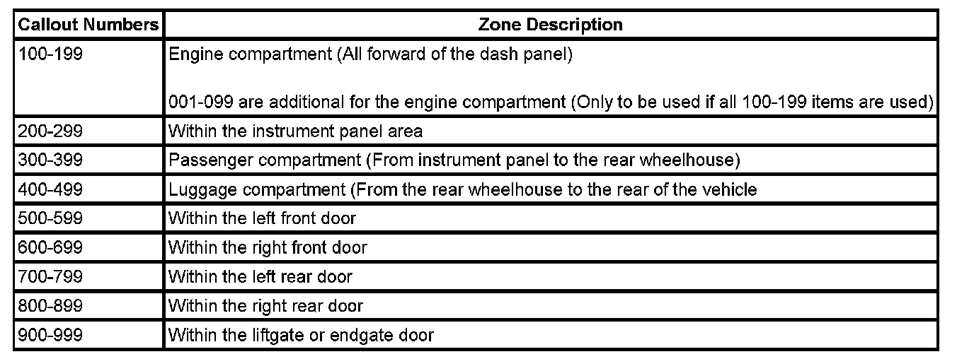 All grounds, in-line connectors, pass-through grommets, and splices have identifying numbers that correspond to where they are located in the vehicle. The table explains the numbering system.