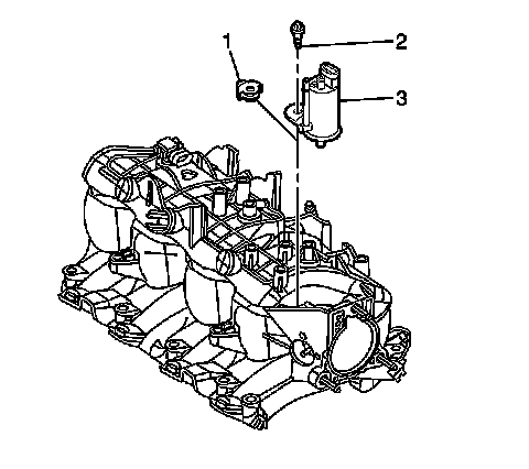 1. Remove the EVAP purge solenoid bolt (2), solenoid (3), and isolator (1) from the intake manifold.