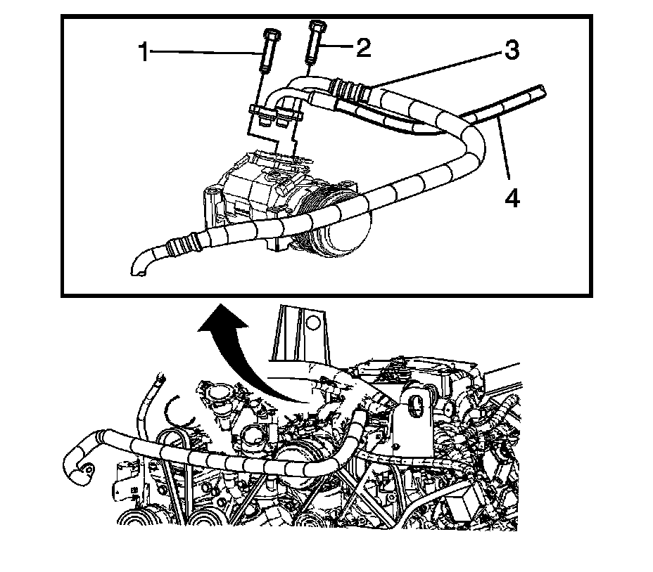 3. Remove the discharge hose bolt (2) from the A/C compressor.