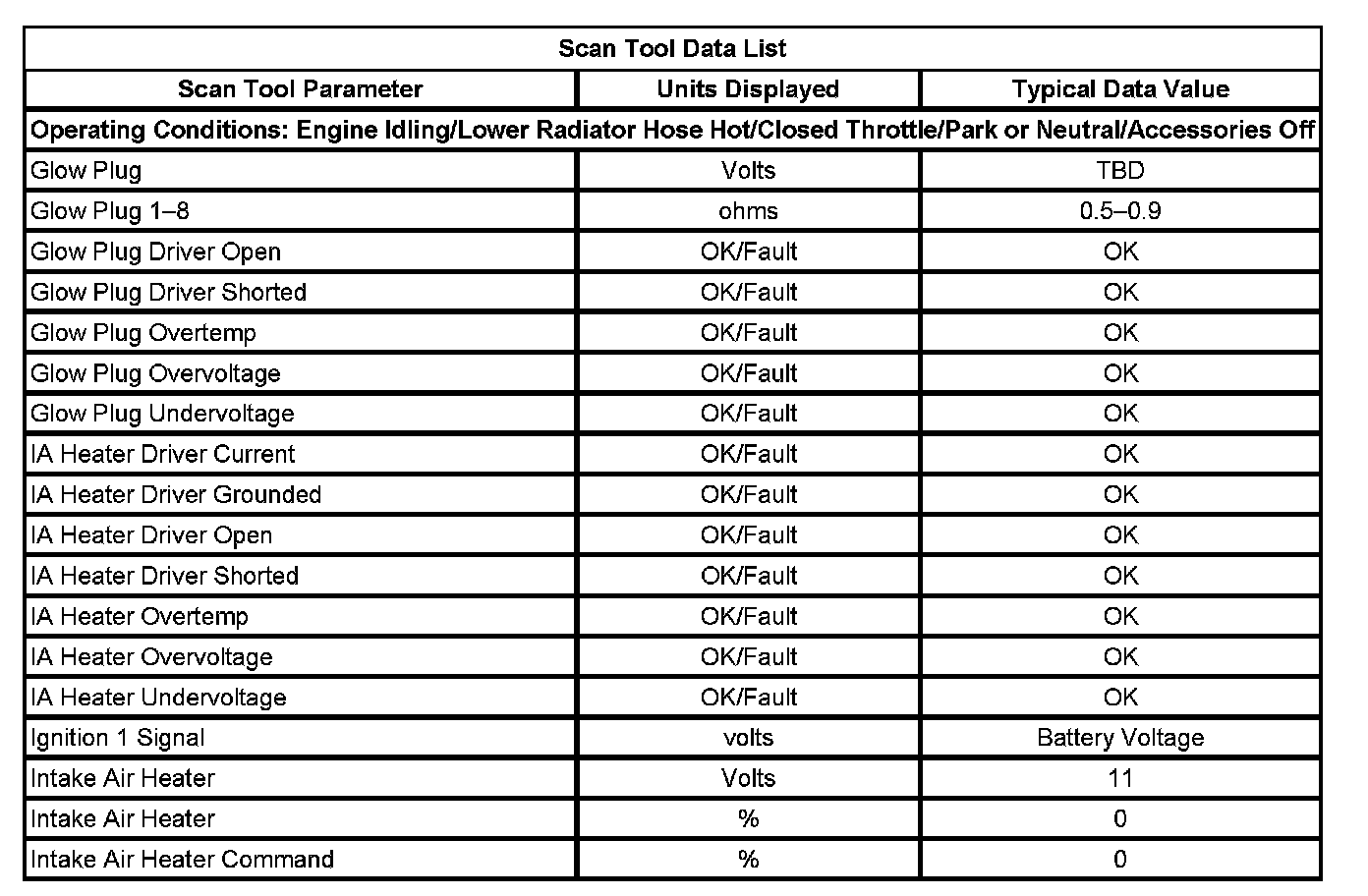 The GPCM Scan Tool Data List contains all glow plug control module related parameters that are available on the scan tool. The list is arranged in alphabetical order.