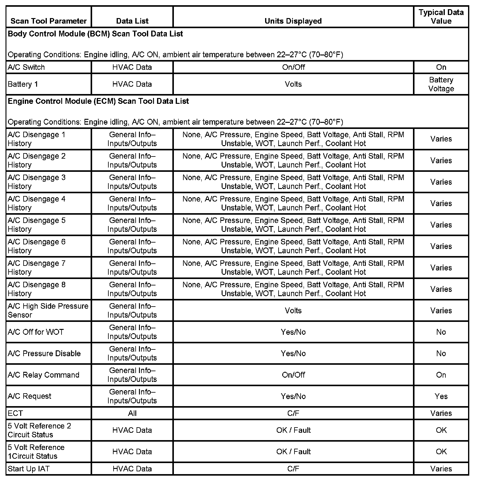 The scan tool data values were taken from a known good vehicle under the following conditions: