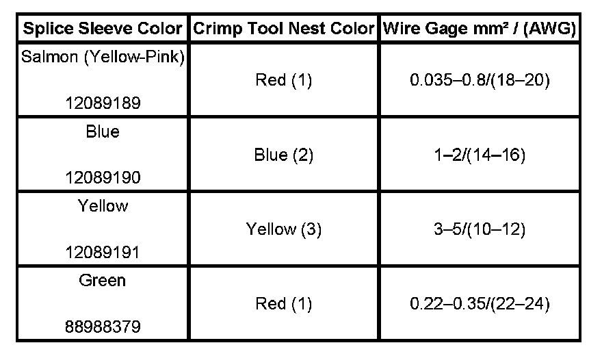 4. Select the proper DuraSeal splice sleeve according to the wire size. Refer to the above table at the beginning of the repair procedure for the color coding of the DuraSeal splice sleeves and the crimp tool nests.