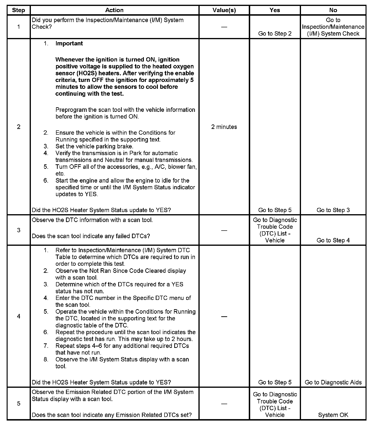 The purpose of this test is to satisfy the enable criteria necessary to execute inspection and maintenance (I/M) readiness diagnostics for the heated oxygen sensor (HO2S) heater system. The test may be used to set the I/M System Status to YES. The I/M System Status Display on the scan tool provides an indication of whether the control module has completed the required tests. The I/M System Status does not indicate that the tests have passed or failed. When all of the diagnostics for a specific system have run and passed the I/M System Status will update to YES. If a test for a specific system has failed, the I/M System Status will update to YES, indicating a determination was made, even if all of the other tests for that system have not run.