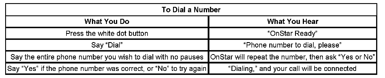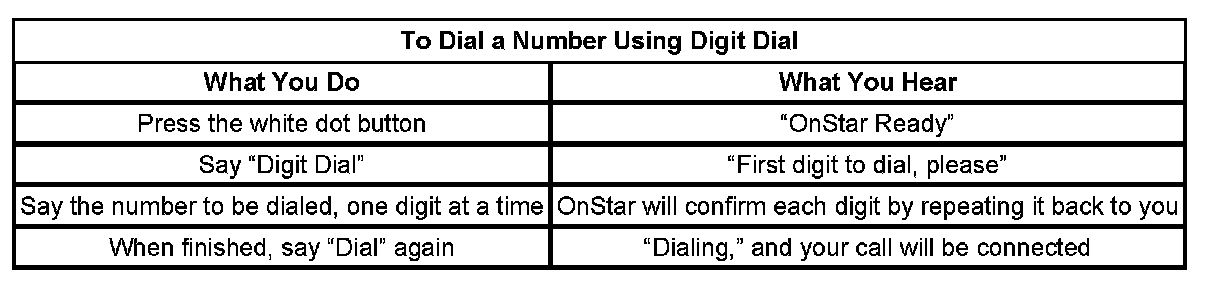 After 3 unsuccessful tries, or if you simply like it better, you can use the "Digit Dial" command to input digits one at a time. Digit Dial is set up to dial phone numbers like previous OnStar Personal Calling Systems.
