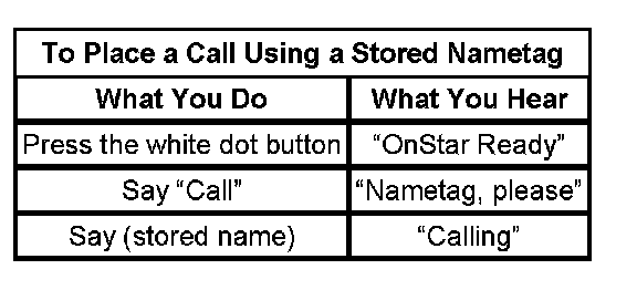 Customers have the ability to store telephone numbers within the module, referenced by a nametag for the convenience of frequently dialed numbers. This process is initiated by pressing the answer/end call button, waiting for the system response, then speaking the response "store". The system will respond with "number please" at which time the user should enter the number desired to be stored. Once complete, saying the word "store" again lets the system know you are finished entering the number. At this time, the system will elicit the user to assign a nametag to that number. From this point forward, the user can dial this number by initiating the OnStar(R) personal calling (OPC) feature, speaking the word "call," and repeating the nametag assigned. To delete a nametag, the user should initiate OPC, say "delete" then speak the nametag to be removed. In the event a nametag cannot be deleted in spite of repeated attempts from several speakers, the OnStar(R) module will require replacement.