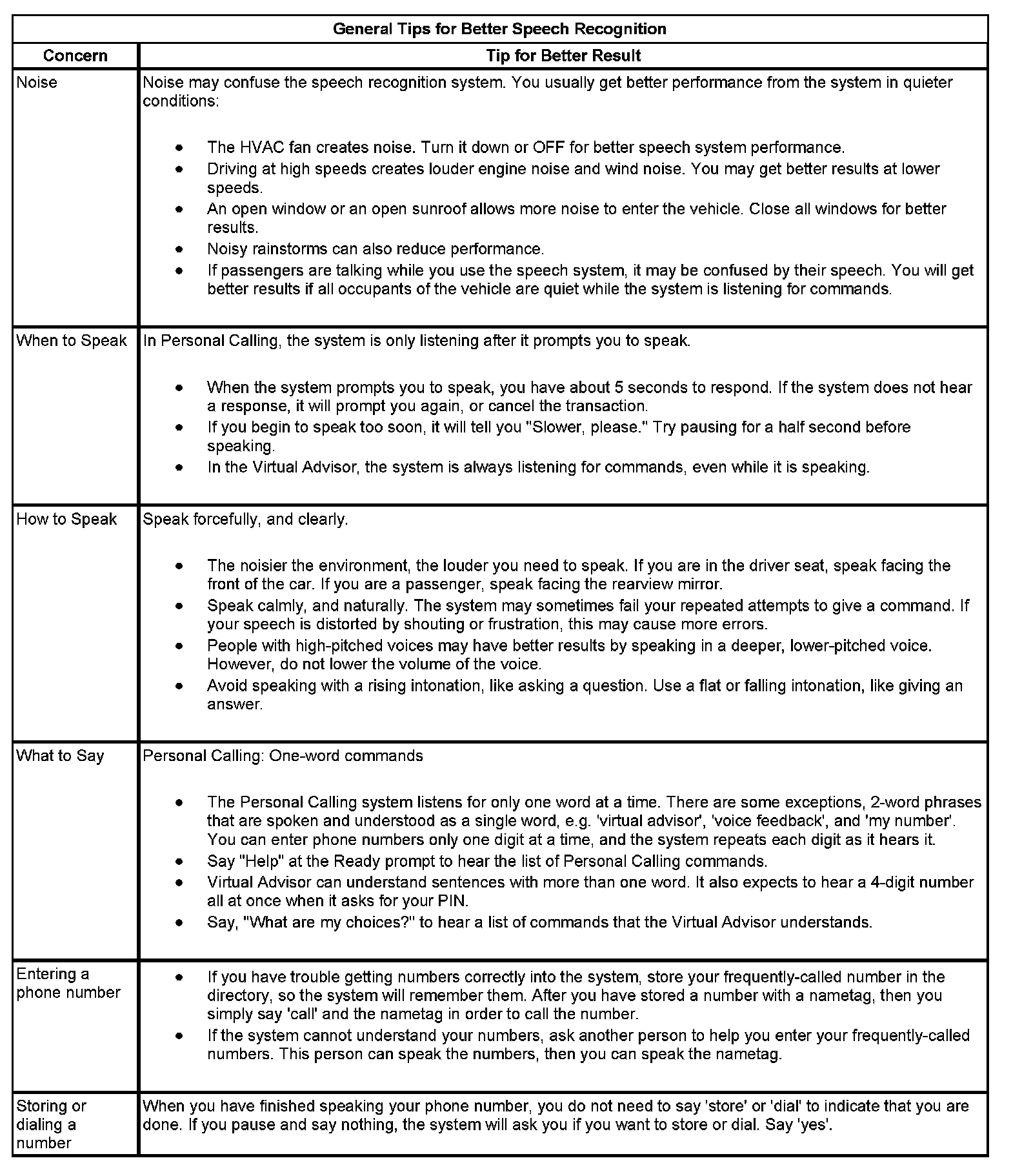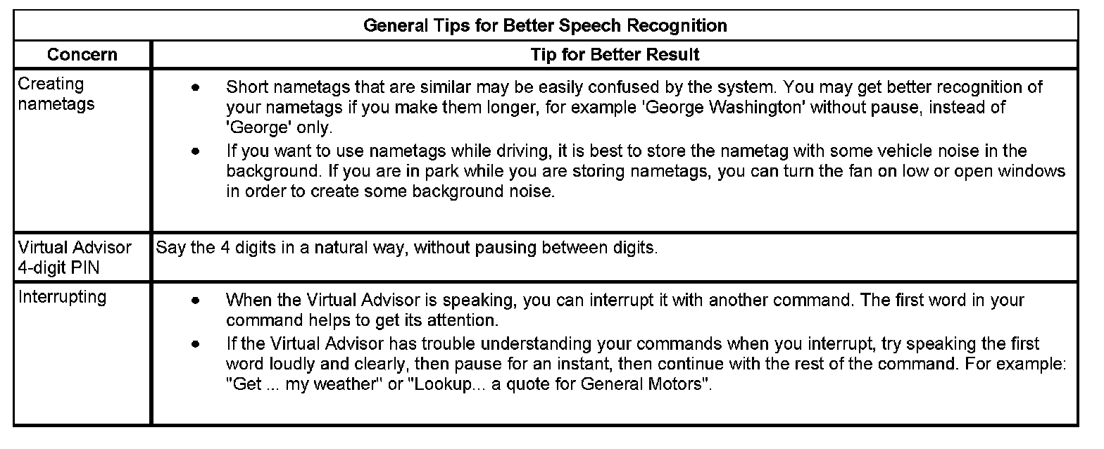 The OnStar(R) speech recognition systems use speech technology that is designed to understand a wide range of American English speakers. Although there is no one right way to speak English, the system will work best when users try to modify their pronunciation should they encounter difficulty. Users who do not obtain good results are advised to try the tips and workarounds.