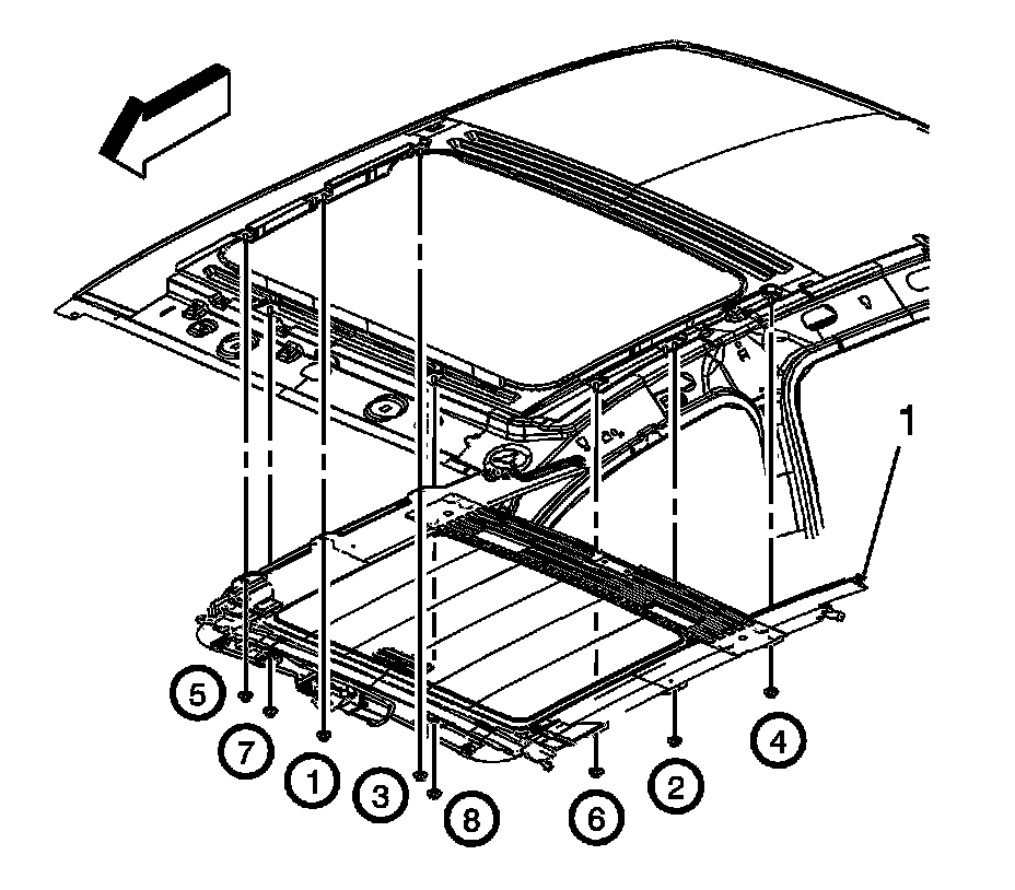 3. Install the remaining sunroof module (1) nuts to the module in sequence (3, 4, 5, 6, 7, 8).