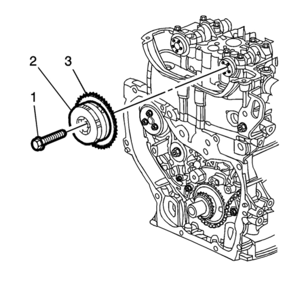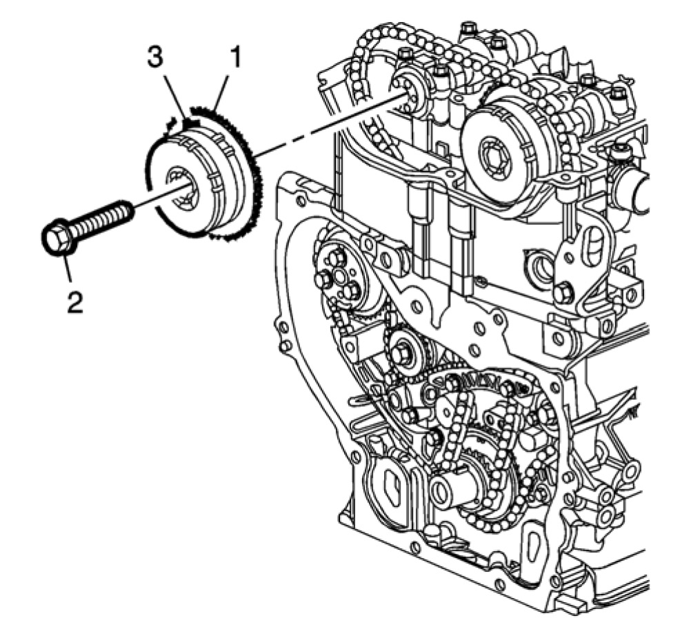 15. Remove the intake camshaft actuator (3), and the timing chain through the top of the cylinder head.
