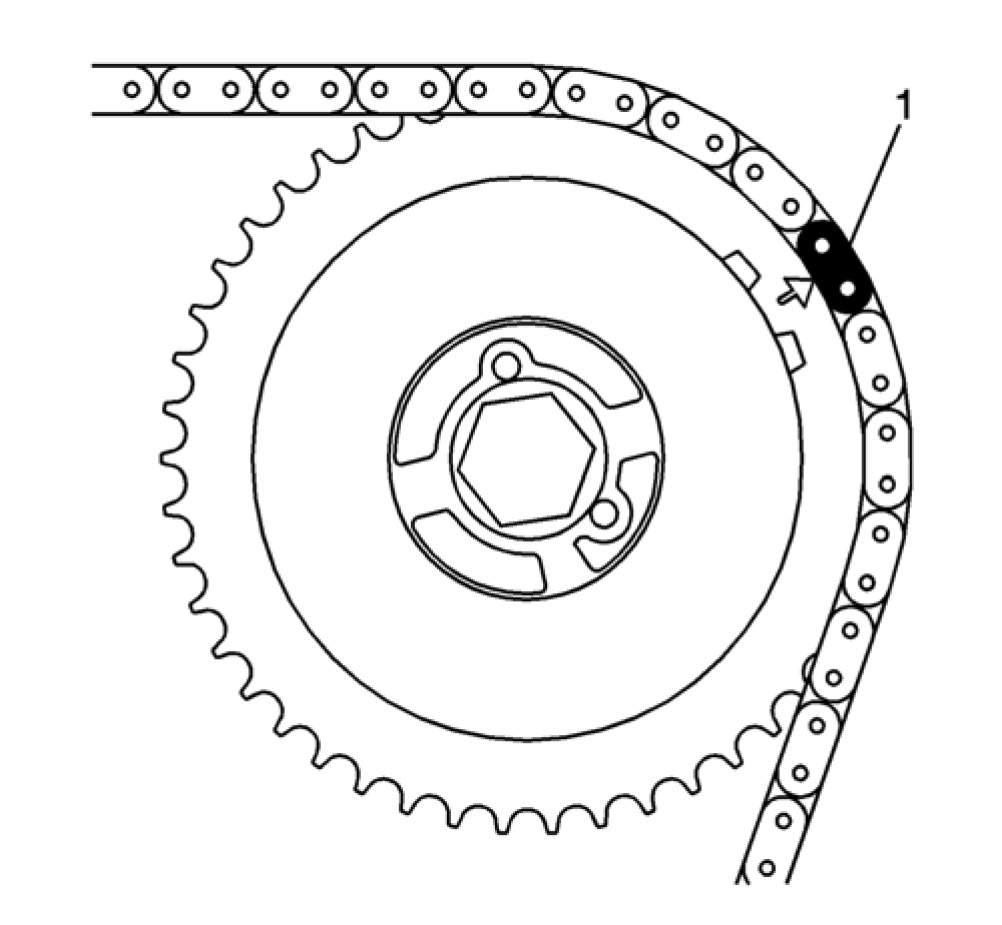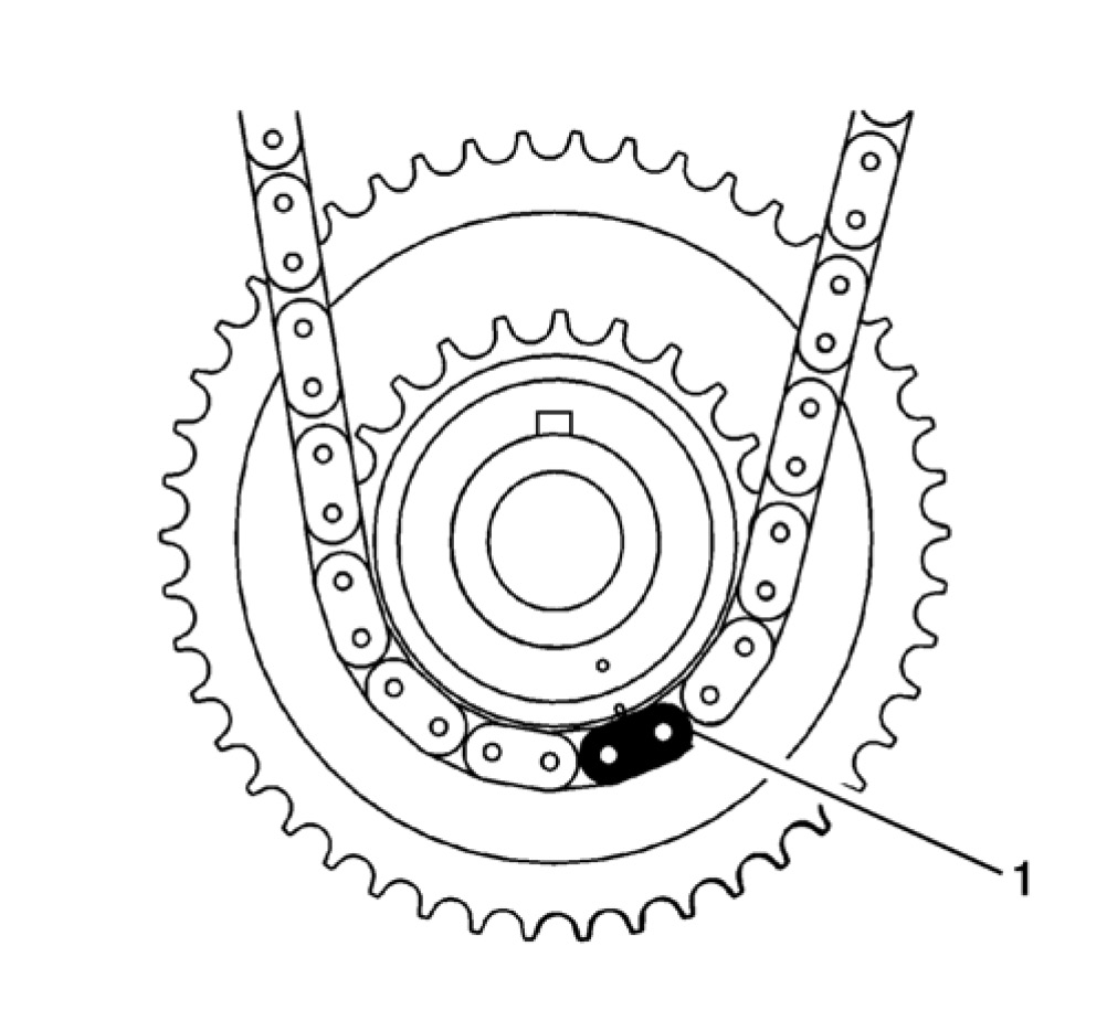 10. Route the timing chain around the crankshaft sprocket and line up the first matching colored link (1) with the timing mark on the crankshaft sprocket, in approximately the 5 o'clock position.