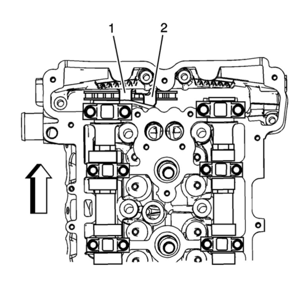 2. Ensure the intake camshaft notch is in the 10 o'clock position (2) and the exhaust camshaft notch is in the 7 o'clock position (1). The number 1 piston should be at top dead center (TDC), crankshaft key at 12 o'clock.