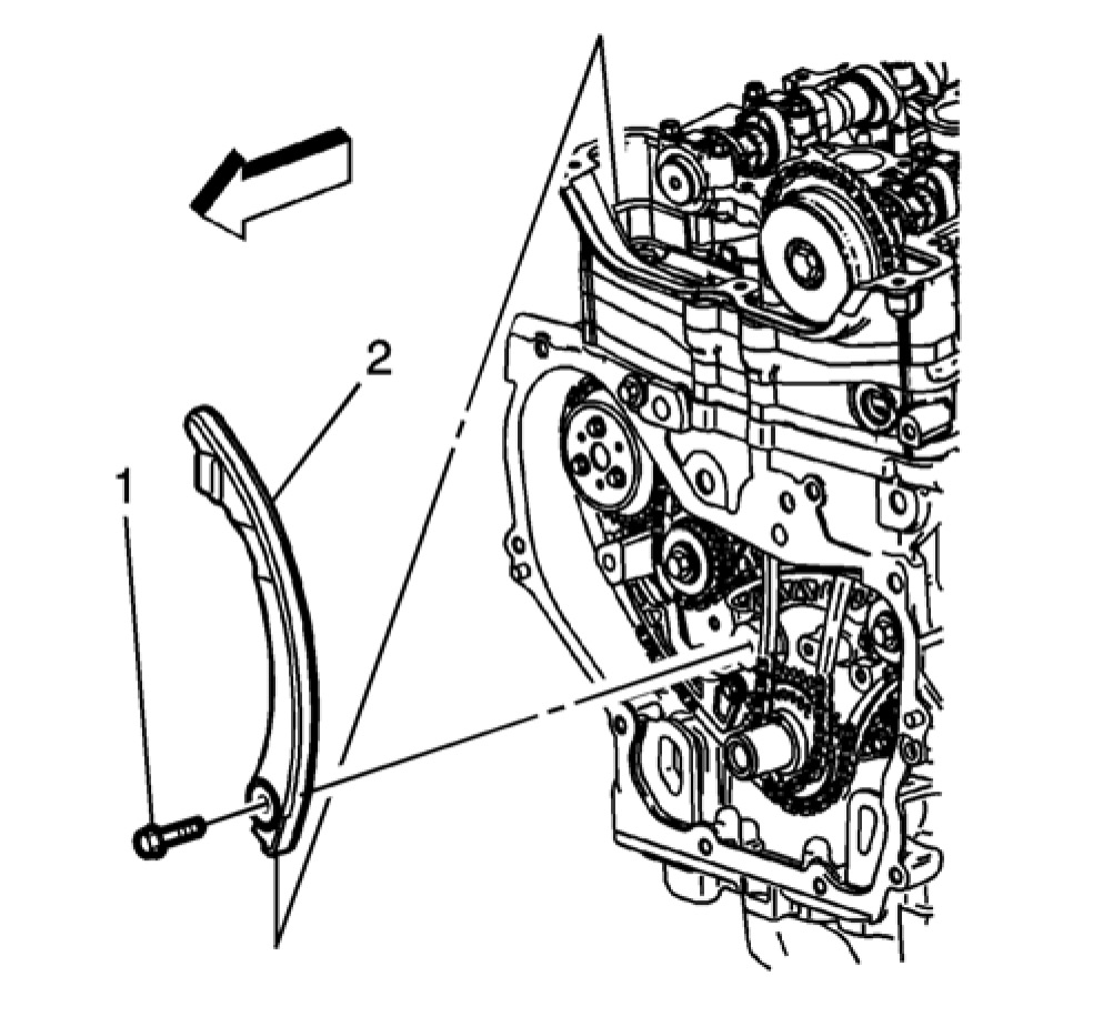 13. Install the adjustable timing chain guide (2) down through the opening in the cylinder head and install the adjustable timing chain bolt (1). Tighten the adjustable timing chain guide bolt to 10 Nm (89 lb in).