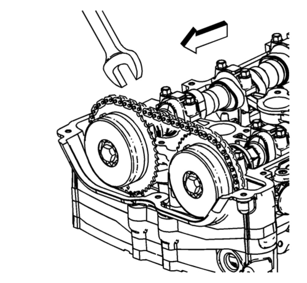13. Install a 24 mm wrench on the hex on the intake camshaft in order to hold the camshaft.