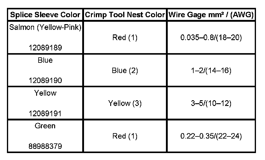 4. Select the proper DuraSeal splice sleeve according to the wire size. Refer to the above table at the beginning of the repair procedure for the color coding of the DuraSeal splice sleeves and the crimp tool nests.