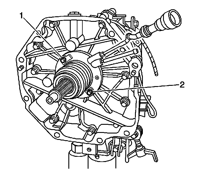 12. Remove the bolts (1, 2) securing the concentric actuator cylinder to the transmission. Graphic shows transmission for clarity. Additional clearance between the transmission and clutch housing may be achieved by continuing to separate the transmission from the clutch housing as the bolts are being removed.