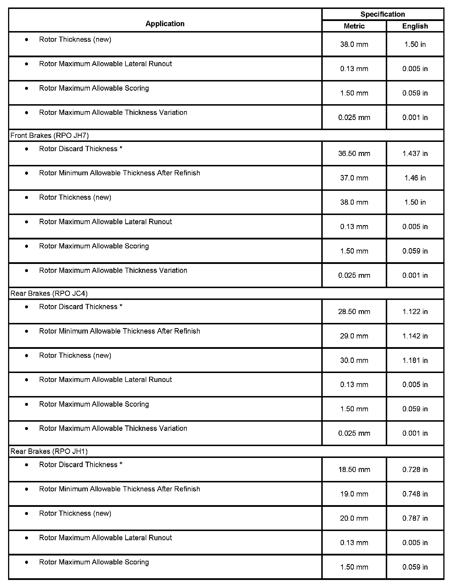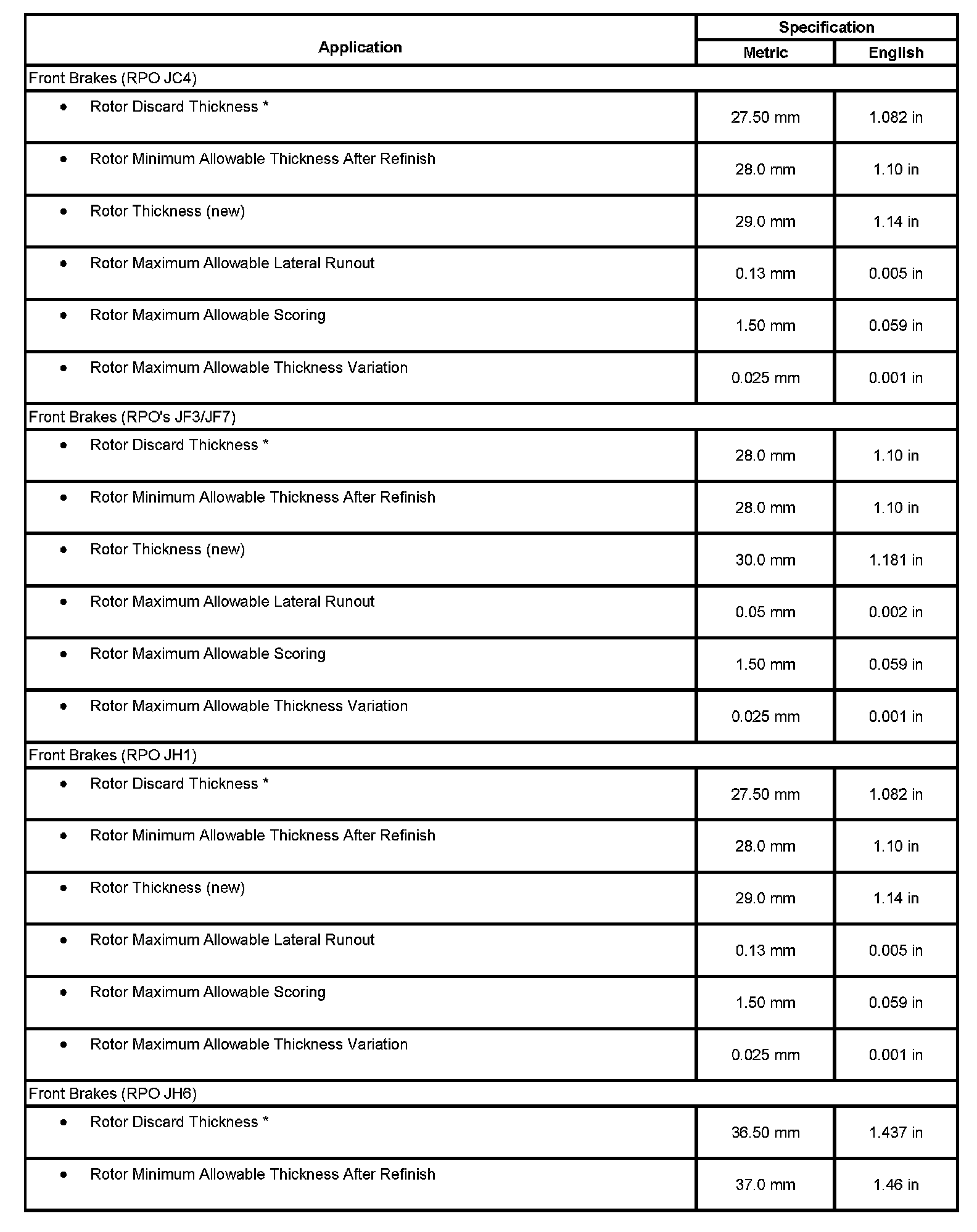 Disc Brake Component Specifications: